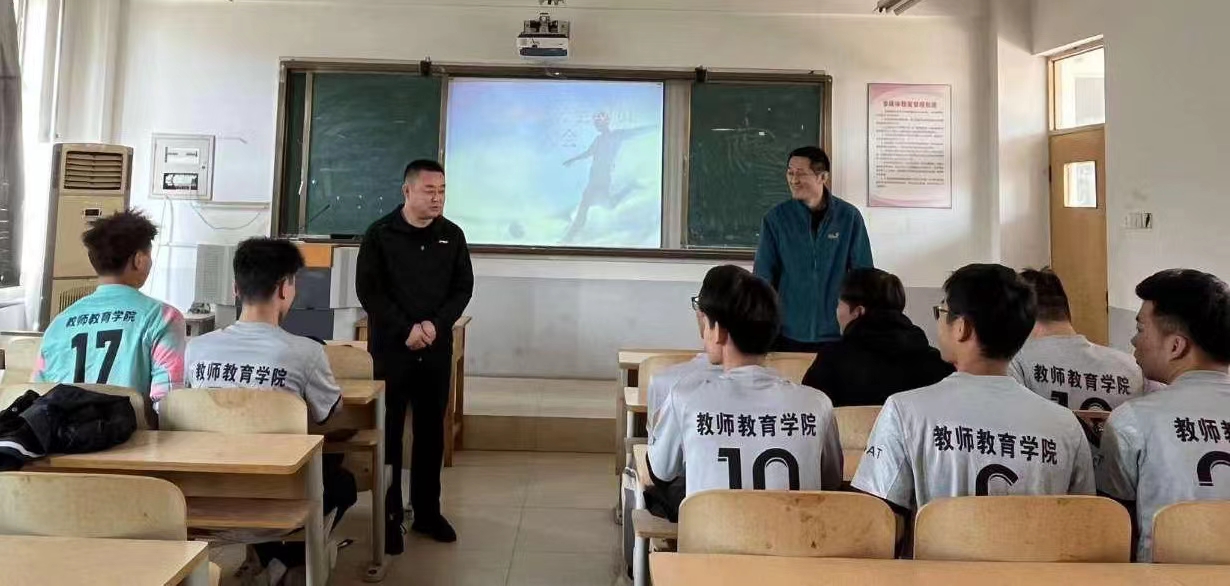 为了激发足球运动员们的比赛热情,鼓励同学们为学院争得好成绩,学院领导老师沈杰和邵启鼎于4月17日上午9:40与足球队运动员们进行了赛前交流。