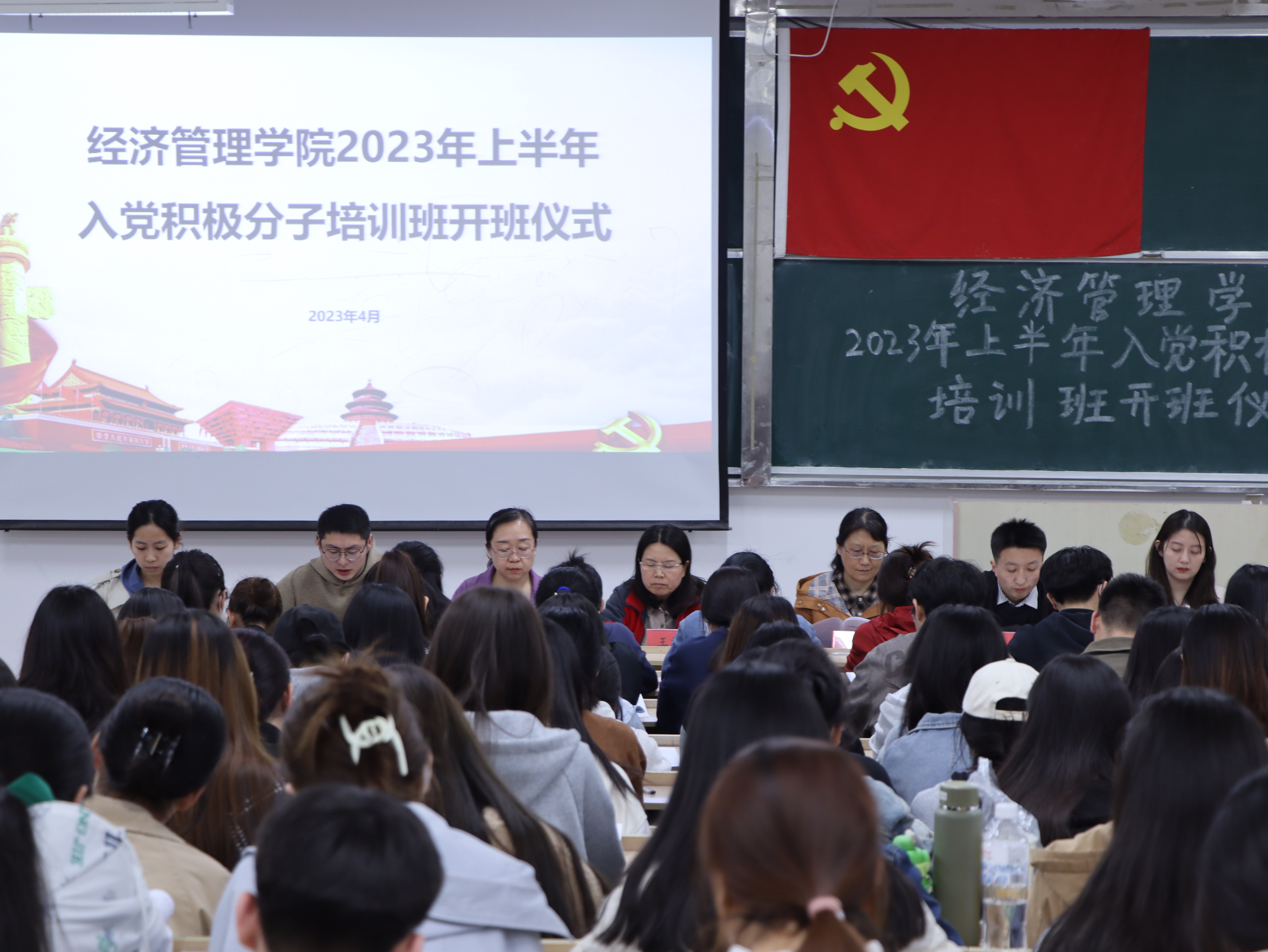 经济管理学院党总支副书记王海梅、学生第一党支部书记于敏、学生第二党支部书记聂国峰、学生第三党支部书记邓豪和辅导员李金芳、郭华盈、王功贺以及2023年上半年全体入党积极分子参加了本次培训班开班仪式。
