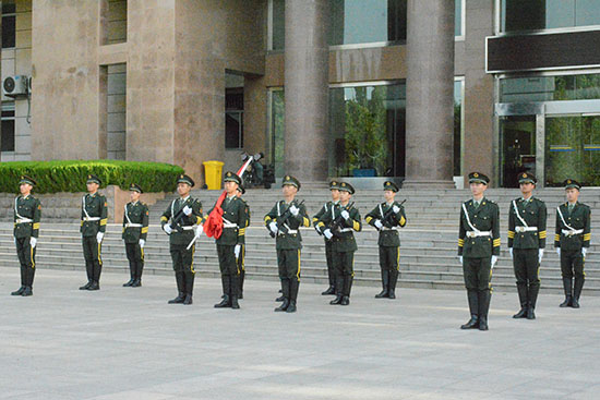 首先旭日东升,国旗护卫队队员迎着朝阳,迈着有力的步伐,庄重严肃的护送国旗入场,伴随着气势磅礴的国歌,五星红旗缓缓升起并在空中熠熠生辉,全体师生深怀对祖国的热爱与敬意向国旗行注目礼。