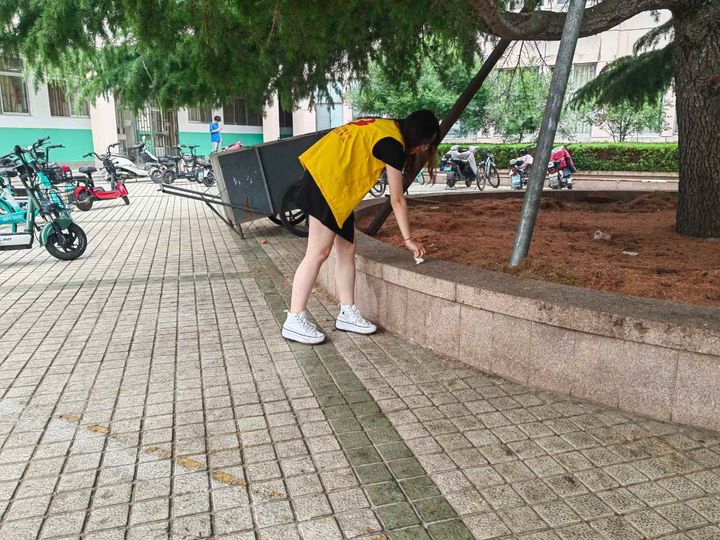 为清洁校园奉献青春力量,传递劳动光荣的传统美德,深化劳动光荣的使命感,潍坊学院经济管理学院红星志愿服务队于2023年5月28日围绕致远楼展开了校园清扫活动。在这绿意盎然的景色里,点点“志愿黄”格外耀眼。