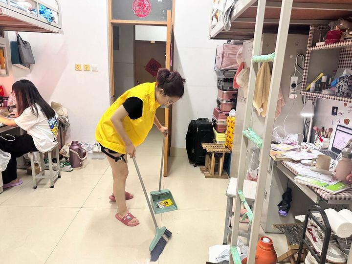 他们仔细清扫宿舍里的每一个角落,用浸湿的抹布擦拭桌凳、柜子和窗户,用刷子清扫厕所和洗手池,将行李箱、小板凳和书包等个人物品集中摆放整齐,扩大了宿舍可用空间,更好的方便同学们生活和学习。此外,队员们还开窗通风,保持宿舍内的空气清新。在大家的共同努力下,宿舍环境焕然一新。良好的宿舍环境不仅仅能够带来舒适的生活体验,更是健康生活的重要保障。