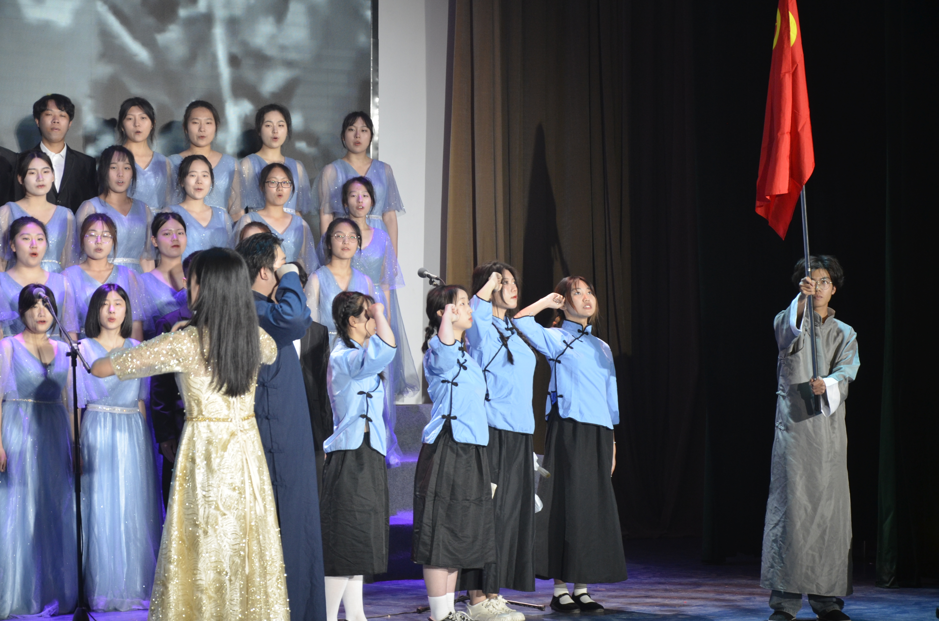 此次合唱比赛深入学习贯彻党的二十大精神,紧紧围绕学习贯彻习近平新时代中国特色社会主义思想主题教育活动精神展开。在激烈的角逐中,各学院团结组织学生积极探索党的二十大精神,以合唱创新性结合舞蹈、朗诵等形式,展现青春风采,彰显新时代青年有理想、敢担当,能吃苦、肯奋斗的精神。其中,政法学院《有我》以情景剧演绎的形式展现青年之力量,以铿锵有力的朗诵向党宣誓“强国有我,请党放心”。同时在气势磅礴的合唱中以昂扬的姿态展现我院的积极进取、奋发有为的精神面貌。最终政法学院在此次合唱比赛中斩获二等奖,政法学院学子赵心舒荣获“优秀指挥员”,充分呈现了团队合作与个人努力相结合的优秀成果。