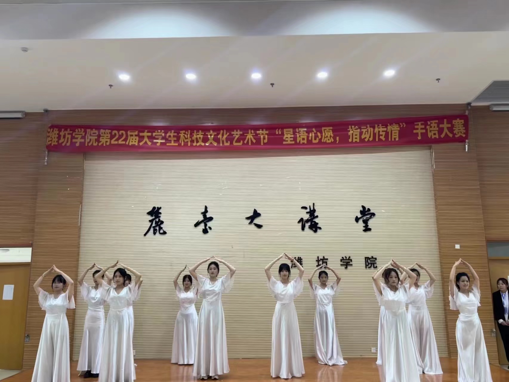 为了丰富校园艺术文化生活,浓厚校园文化氛围,在我校推广手语,让更多的同学了解手语,学习手语,关注无声世界的朋友们。让我校同学充分发挥出自己能力突出各自专业特色,使同学们将手语与自己的专业完美结合,为社会贡献一份力量。为此,潍坊学院教师教育学院(特教幼教师范学院)心言手语社特举办“星语心愿,纸动传情”手语大赛。2023年5月13日晚上7:00,参赛同学在潍坊学院(安顺校区)三号楼四楼报告厅进行展演。