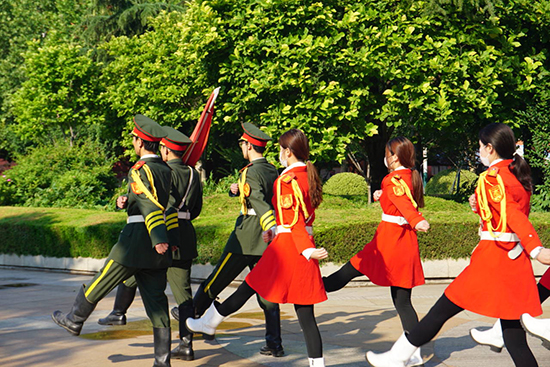国旗护卫队迈着整齐划一、铿锵有力的步伐,将国旗护送至升旗台,全场师生肃然起敬,在神圣的中华人民共和国国歌中,凝望着五星红旗冉冉升起。