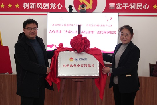 为积极响应团中央“百万大学生进社区”的号召,进一步加强校地合作,实现高校与社区治理的“双向赋能”,12月13日,潍坊学院天瑞磁悬浮产业学院与奎文区新城街道锦华社区共建“大学生社会实践基地”签约揭牌仪式在锦华社区举行。天瑞磁悬浮产业学院党总支书记、院长宋广景,锦华社区党委书记贾冰,天瑞磁悬浮产业学院团总支书记崔秀玲出席了此次活动。