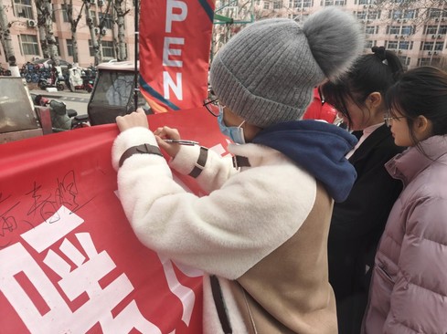 活动伊始,志愿者在第二餐厅旁拉起印有“三月春风暖人心,雷锋精神伴我行”的横幅,邀请同学们参加签名活动,同学们持笔在横幅上留下自己的名字,以签名为承诺,为宣传雷锋精神贡献自己的一份力量。签名活动结束后,志愿者们一起手拉横幅,庄严宣誓:“作为一名青年大学生,要争做新时代的活雷锋,让雷锋精神在校园里传承不息。”志愿者们坚定的表情和庄严的宣誓声,感召着在场的所有人,带动了更多的人感悟雷锋精神。