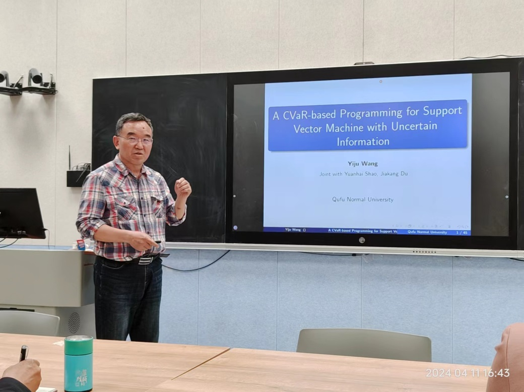 4月11日下午,数学与统计学院在“数苑大讲堂”举办专家报告会,邀请曲阜师范大学王宜举教授做题为“一种基于CVaR的不确定信息支持向量机优化模型”的学术报告。学院院长李梅霞教授主持报告会,学院全体教师参加。