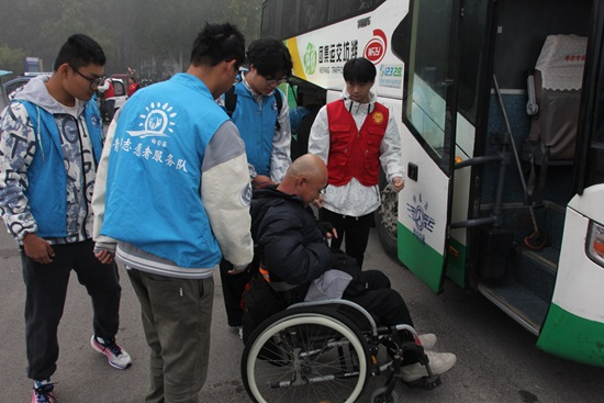 活动当天,生物与海洋学院的8名志愿者早早来到集合点,协助残友们坐上大巴车,完成安放轮椅等工作。每位志愿者与一位残友相组为伴,协助其当日的所有事宜。