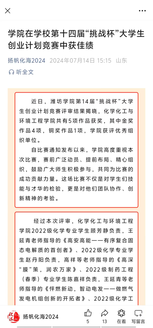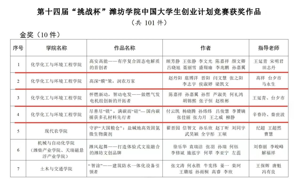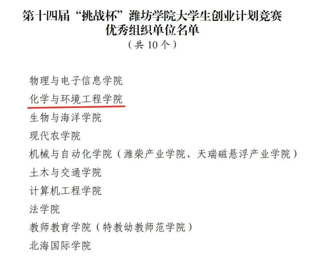 近日,潍坊学院第14届“挑战杯”大学生创业计划竞赛评审结果揭晓,化学化工与环境工程学院共有5项作品获奖,其中金奖作品4项,铜奖作品1项,学院获评优秀组织单位。
