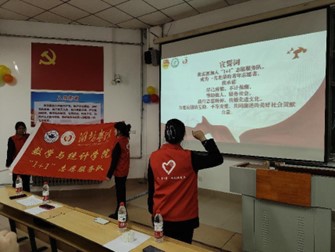 副总队长田然宣读了《志愿服务条例》,明确了志愿服务的规范和准则,为志愿者们提供了行动指南。总队长刘巧如带领全体成员共同宣誓,承诺将秉持“奉献、友爱、互助、进步”的志愿服务精神,积极参与各类志愿服务活动,为建设更加团结互助、平等友爱、共同前进的美好社会贡献青春力量。新一届志愿服务队成员代表孙浩铨在发言中表达了自己的志愿服务目标,他希望能够与其他志愿者携手共进,用热爱充实自我,用青春践行志愿,共同为和谐社会贡献力量。
