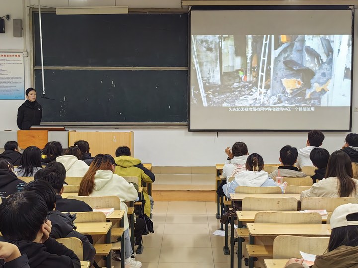 在班会上,各位辅导员利用图片、视频等多种形式向同学们展示了因疏忽大意可能导致的火灾事故场景,触目惊心的画面让同学们深刻认识到火灾的危险性。例如,宿舍违规使用大功率电器、易燃物违规放置、禁烟区域吸烟、实验室操作不当等常见情况,都可能成为引发火灾的关键因素。