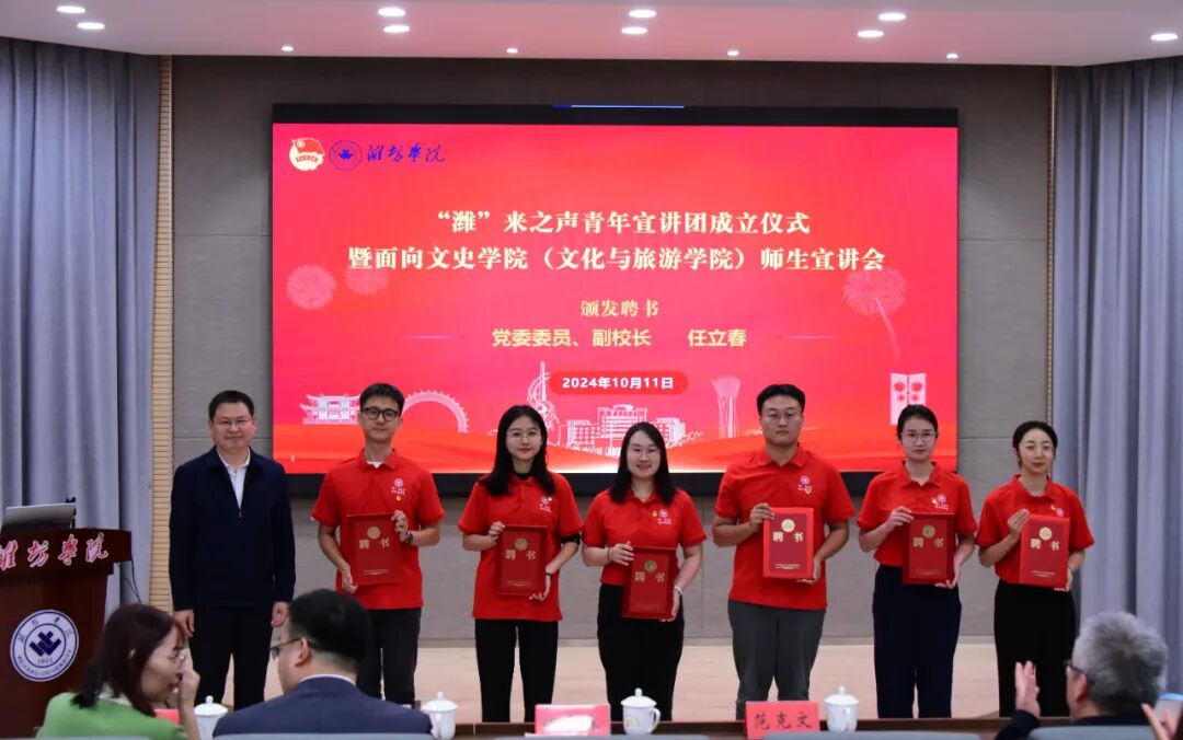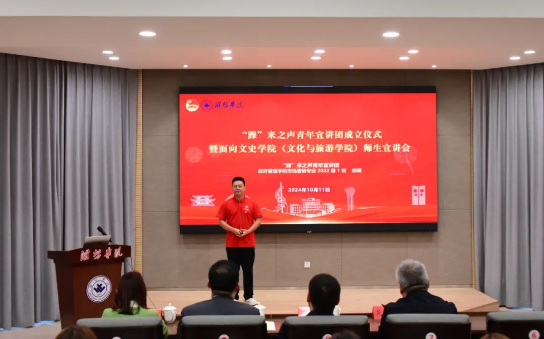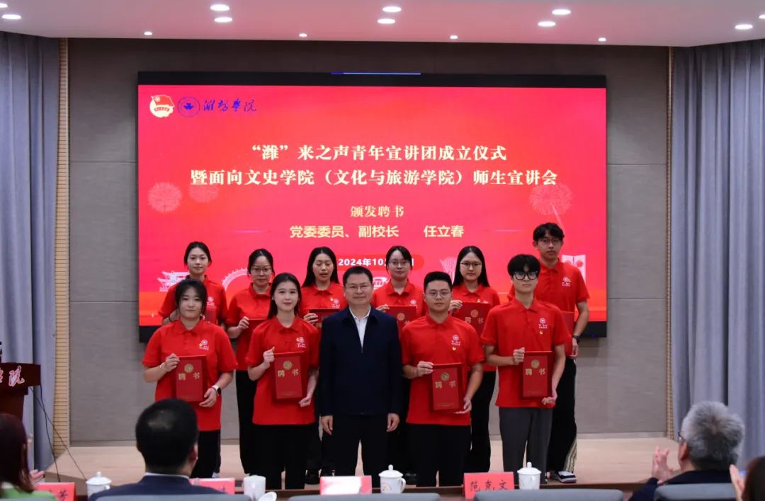 为深入学习贯彻习近平新时代中国特色社会主义思想和党的二十届三中全会精神,以“青言青语”阐释解析马克思主义中国化最新成果,对青年学生进行理想信念教育,10月11日,校团委在知新楼4210举办“潍”来之声青年宣讲团成立仪式暨面向文史学院(文化与旅游学院)师生宣讲会。学校党委委员、副校长任立春出席活动。