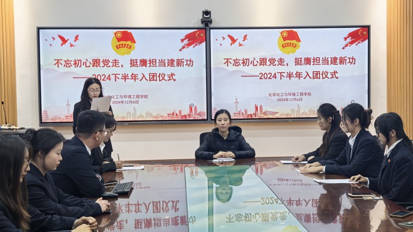 为深入贯彻习近平新时代中国特色社会主义思想,引领广大团员牢记入团初心,坚定入团信念,2024年12月6日12时,化学化工与环境工程学院团委在人合楼8213会议室举行了2024年下半年新发展团员入团仪式,学院团委负责人赵文婷老师出席会议,优秀团员代表及21名新发展团员参加,团委组织宣传部副部长管代第主持本次仪式。