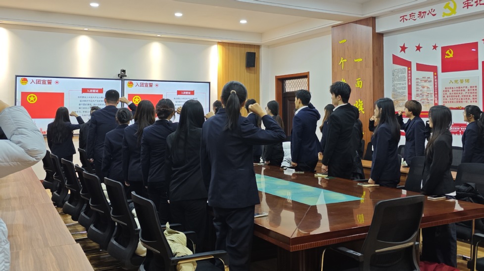 随后,王梓萌带领新团员进行宣誓,新团员们右臂上举,握拳齐眉,齐声高呼入团誓言,声音铿锵有力。誓词,自此深植心间,化作他们砥砺奋进、坚守信仰的青春誓言。
