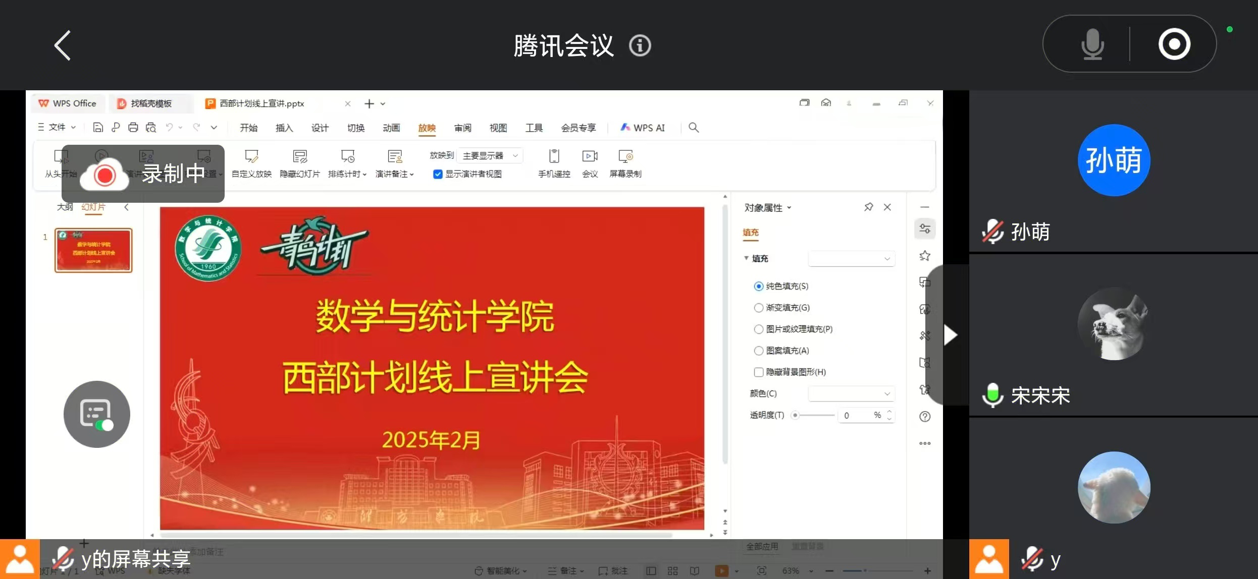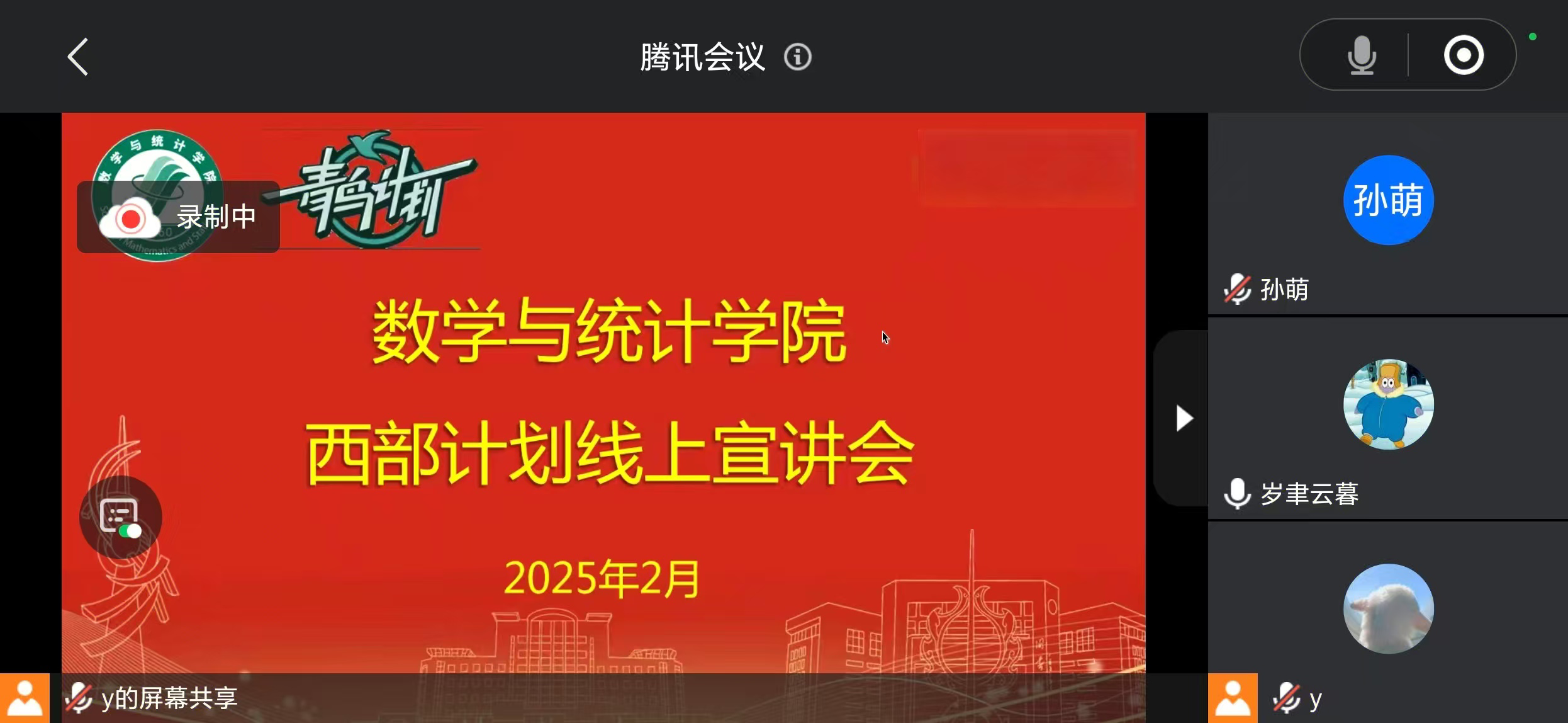 为做好西部计划宣传,引导同学们积极参与西部计划,2月27日晚,数学与统计学院举办西部计划线上宣讲会。本次宣讲会由学院团委副书记宋志鹏、2020级西部计划优秀志愿者刘铎、邵佳怡主讲,2021级部分同学参加,学生会就业服务部负责人杨治军主持。