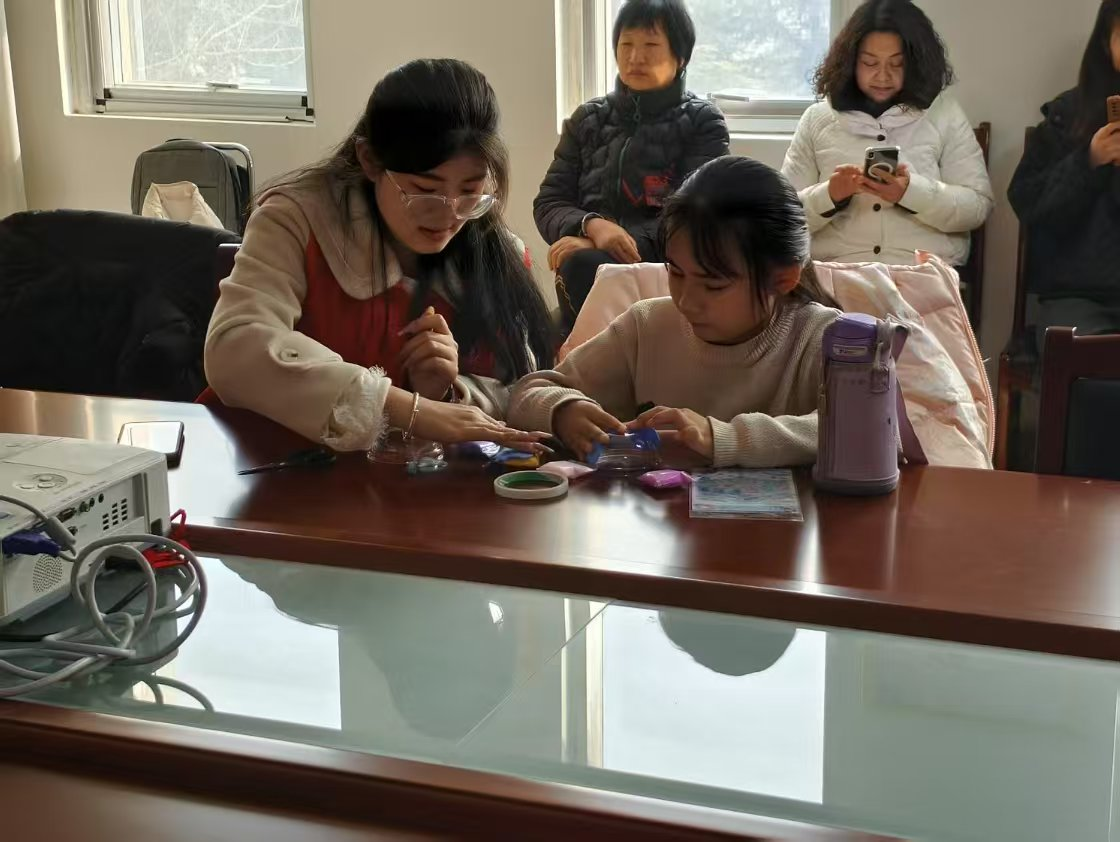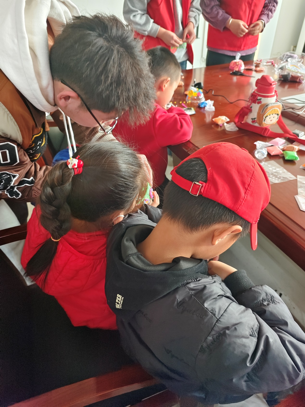 动手实践环节,志愿者们为每位小朋友准备了包含奶茶盖、超轻粘土、透明弹力线等材料的“魔法材料包”。孩子们在志愿者的指导下,发挥创意,将普通的奶茶盖变身为风铃、挂饰等手工作品。志愿者们耐心解答疑问,帮助孩子们克服制作中的困难,现场充满了欢声笑语。