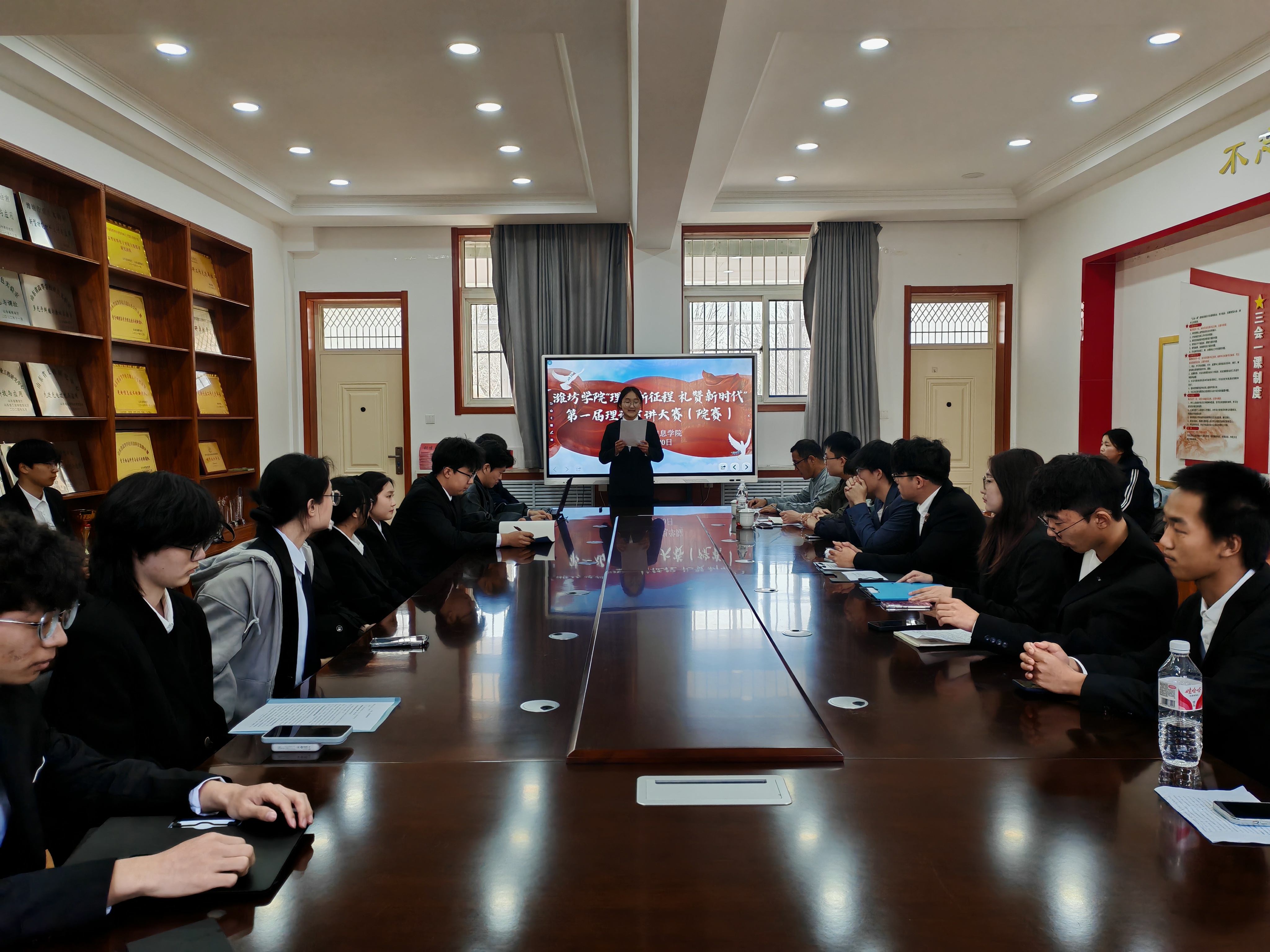 为深入学习宣传贯彻党的二十大精神,引导青年学子以理论宣讲为契机,凝聚起奋勇前行的磅礴力量,物电学院于2025年3月20日在5205教室成功举办了首届“理响新征程 礼赞新时代”理论宣讲大赛。本次比赛由辅导员金波昌、于龙,学生会主席别星志担任评委,共有15名来自不同专业的学生选手踊跃参赛,各展风采。