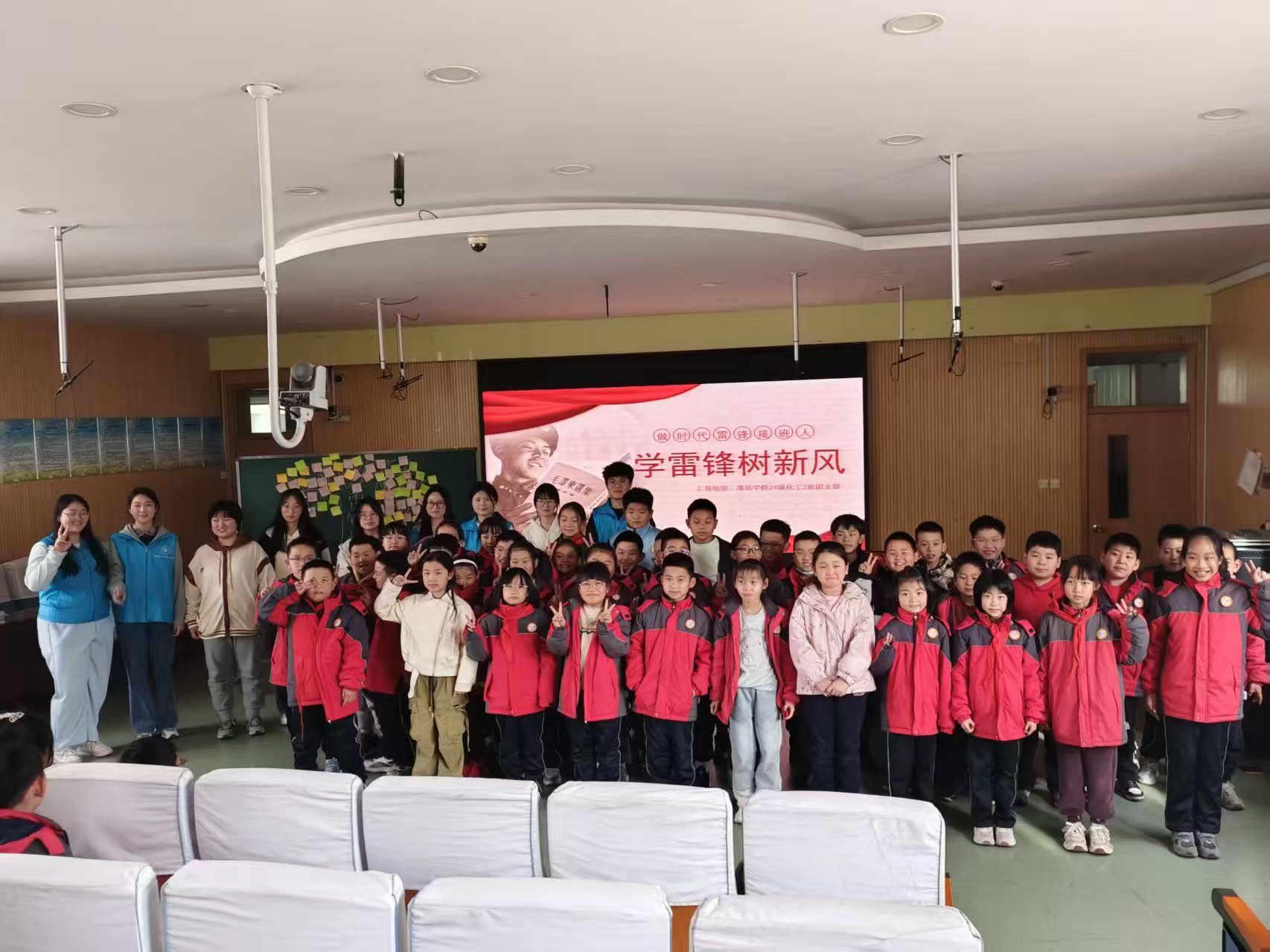 活动当日,团员们早早地在潍坊学院北门集合前往樱园小学。抵达小学门口后,在学校负责人的引领下,团员们有序步入多媒体教室。趁着小学生尚未到来,团支书带领团员们紧锣密鼓地为活动做最后的筹备工作。活动正式拉开帷幕,团支书借助精心制作的PPT,向现场的同学们详细介绍了雷锋的生平事迹以及雷锋月的起源。生动的讲解瞬间点燃了台下同学们的热情,现场气氛热烈非凡。紧接着,团员们纷纷上台,为小学生们分享一个个感人至深的雷锋故事。质朴的讲述深深打动了在场的每一位听众,小学生们纷纷表示,要以雷锋为榜样,学习他身上的美好品质。而后,团支书对雷锋精神的时代内涵进行了深刻总结,进一步升华活动主题,让雷锋精神的种子在每个人心中生根发芽。活动尾声,团员们为每个小学生发放了便利贴,小朋友们认真写下自己的感悟,并庄重地贴在特制的“雷锋树”上,寓意着让雷锋精神如同树木开花般,绽放生机,永驻心间。