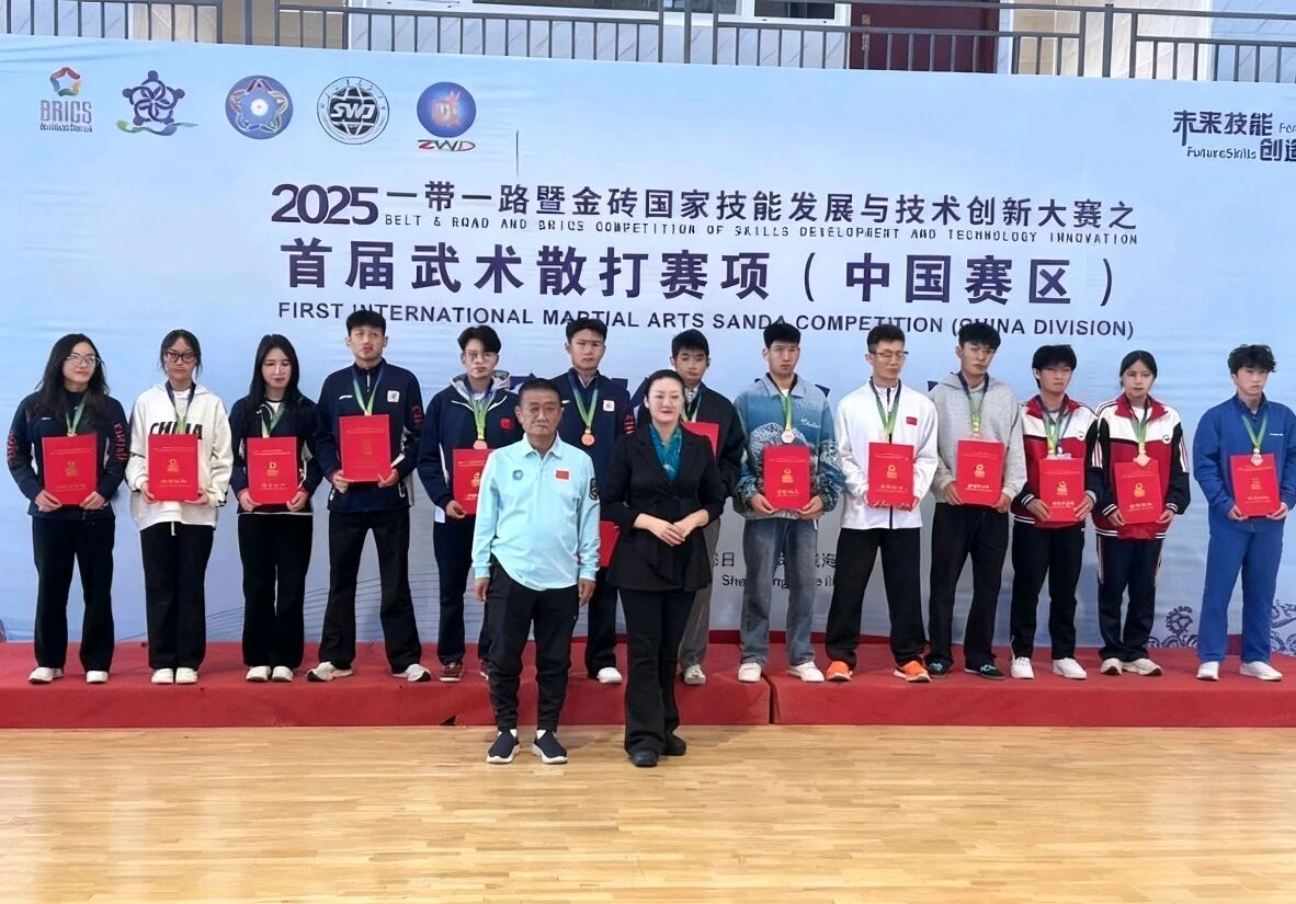 10月25日,2025年一带一路暨金砖国家技能发展与技术创新大赛之首届武术散打赛项在威海乳山落下帷幕。学校体育学院代表队由体育学院教师刘东东组队参加。5名队员获一金一银二铜的佳绩。