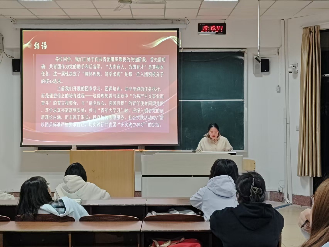 此次系列团课的开展,不仅夯实了参训学员的思想根基,强化了他们的历史认同感与时代责任感,更让“向团靠拢、向党看齐”的信念深深扎根于内心,为马克思主义学院育人工作走深走实奠定坚实基础。