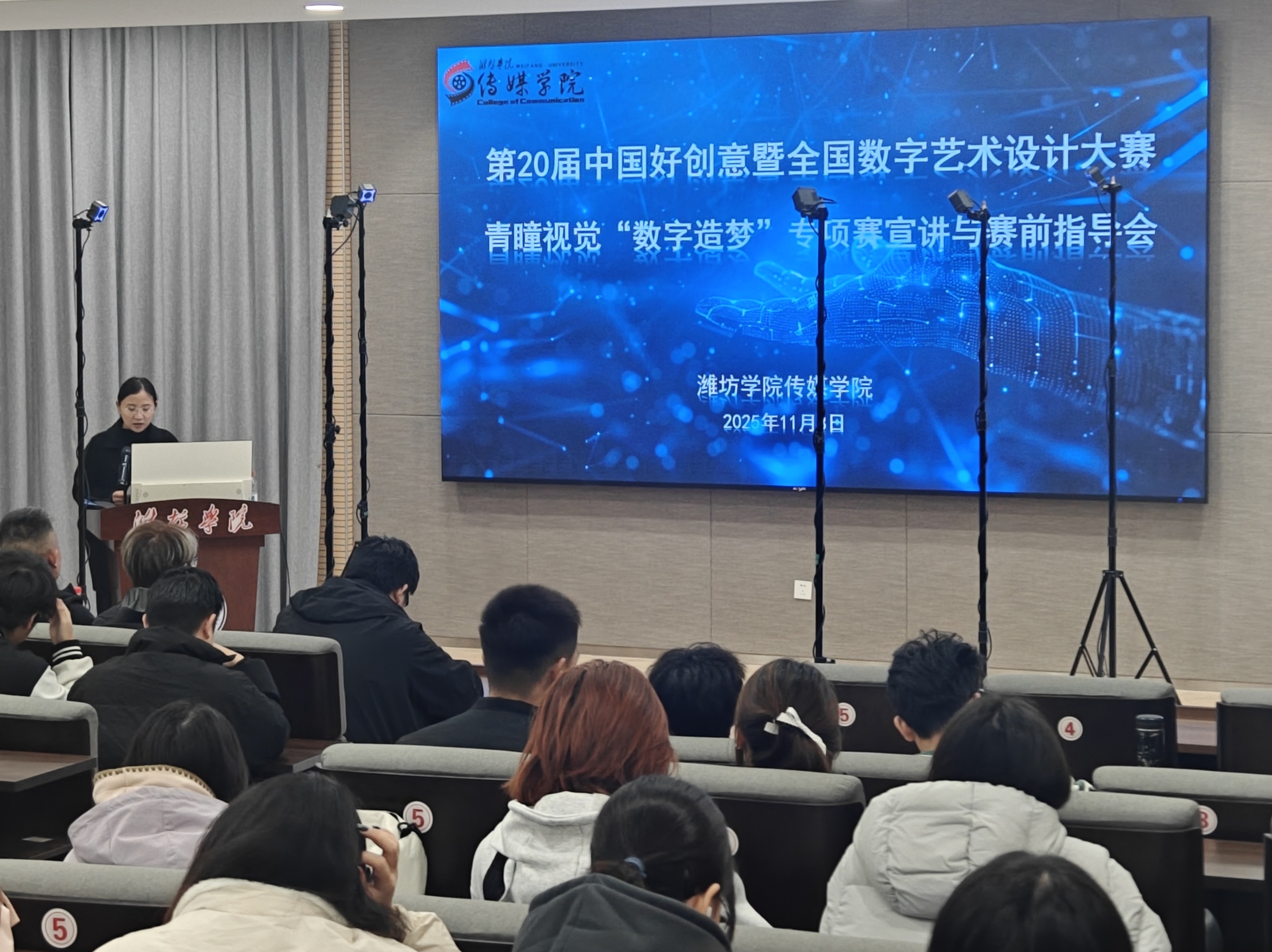 为深化数字创意人才培养,推动产学研深度融合,助力师生精准把握赛事核心要求,11月8日,第20 届中国好创意暨全国数字艺术设计大赛青瞳视觉 “数字造梦” 专项赛潍坊学院站宣讲与赛前指导会在知新楼4210正式举行,大赛组委会代表和传媒学院各专业学生参加。