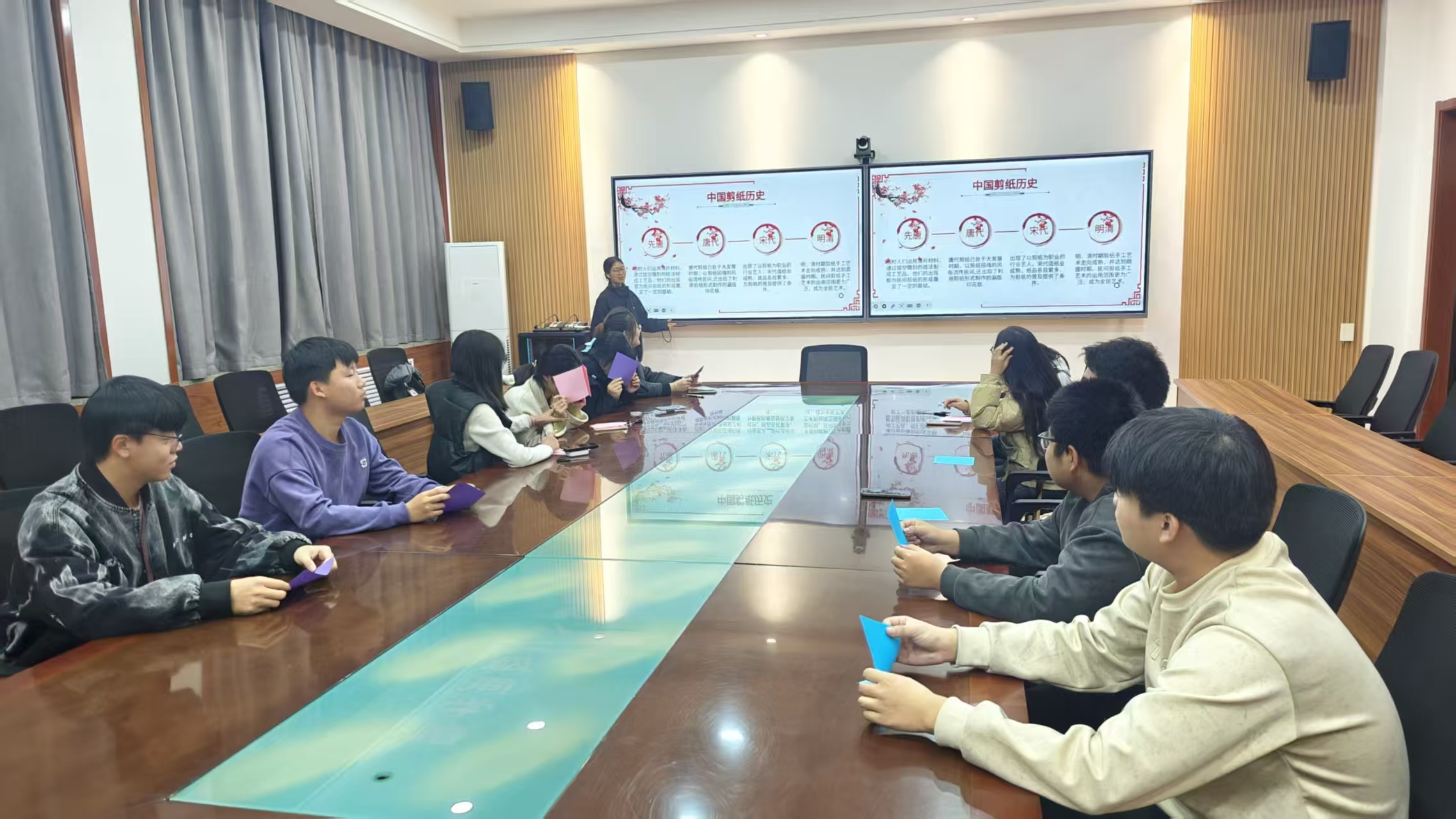 活动伊始,团支书康嘉琦以PPT与短片相结合的形式,系统讲述剪纸历史:从北朝“对马团花”到唐代“窗花”习俗,再到明清“礼俗剪纸”,同学们在时空穿梭中体会到剪纸“源于汉、兴于唐、盛于清”的绵长脉络。随后,她按照“题材、技法、用色”三维标准,将剪纸分为花鸟、吉语、戏剧、生肖等类别,并重点介绍陕西延安粗犷雄浑、江苏扬州玲珑细腻、广东佛山铜凿艳丽、河北蔚县点彩绚丽四大地域流派。一幅幅“黄土高坡红”“江南水乡粉”“岭南金铜凿”“塞北点彩蓝”的对比图,让现场不时发出赞叹。