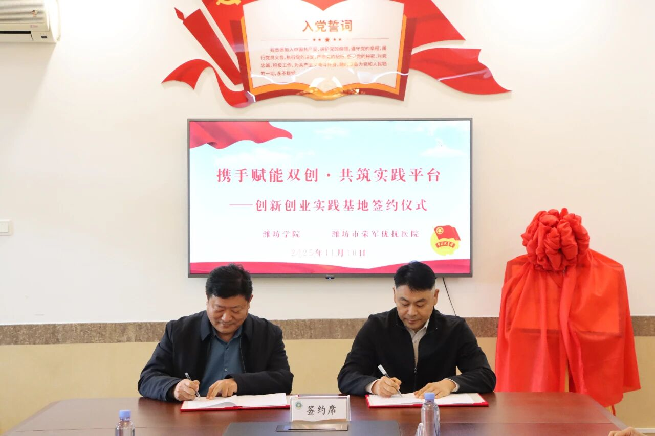 11月10日,教师教育学院(特教幼教师范学院)与潍坊市荣军优抚医院开展创新创业实践基地签约活动。潍坊市荣军医院党委书记、院长刘旭升,教师教育学院党委副书记、副院长许华波出席活动。潍坊市荣军优抚医院各科室相关负责人,教师教育学院师生代表4人参加此次活动。