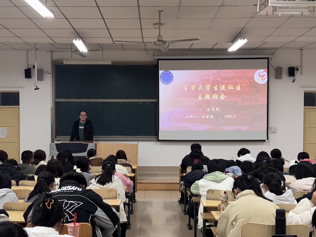 为深入落实“百万大学生进社区”社会实践行动部署,引导法学院学子扎根基层沃土、践行青春担当,11月13日,法学院于人合楼8311教室举办“百万大学生进社区”实践教育主题班会。本次班会由院团委负责人刘雪乾主讲,2025级全体新生参会。