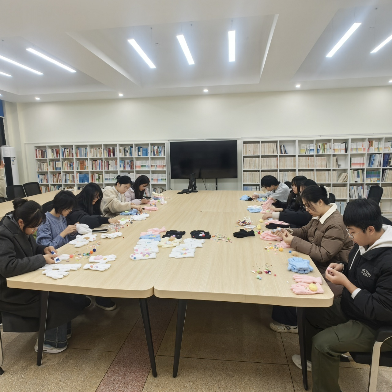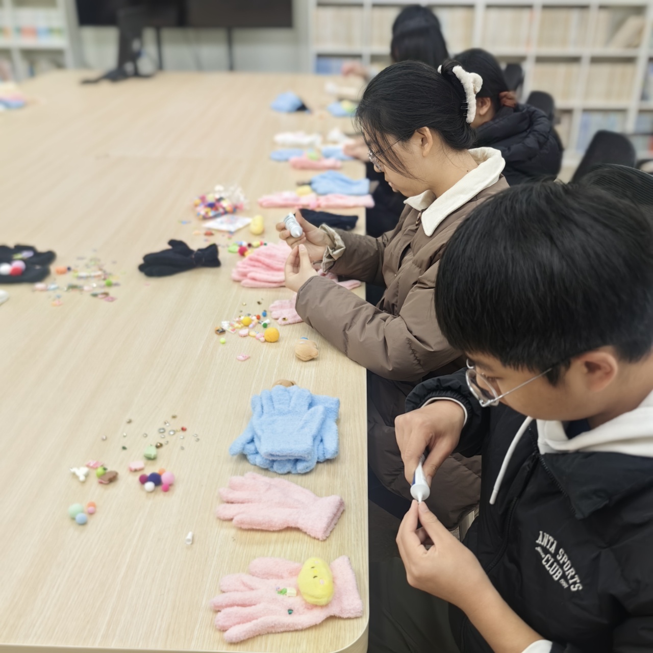 创作过程中,大家以针织手套为载体,巧用刺绣贴、胶水等材料,将“爱心”“纽带”等帮扶意象,与“笑脸”“阳光”等温暖元素巧妙融合,设计出兼具实用性与心意的专属手套。这些满载诚意的作品最终将全部赠予受助学生,让马克思主义学院的关怀变得可触可感。