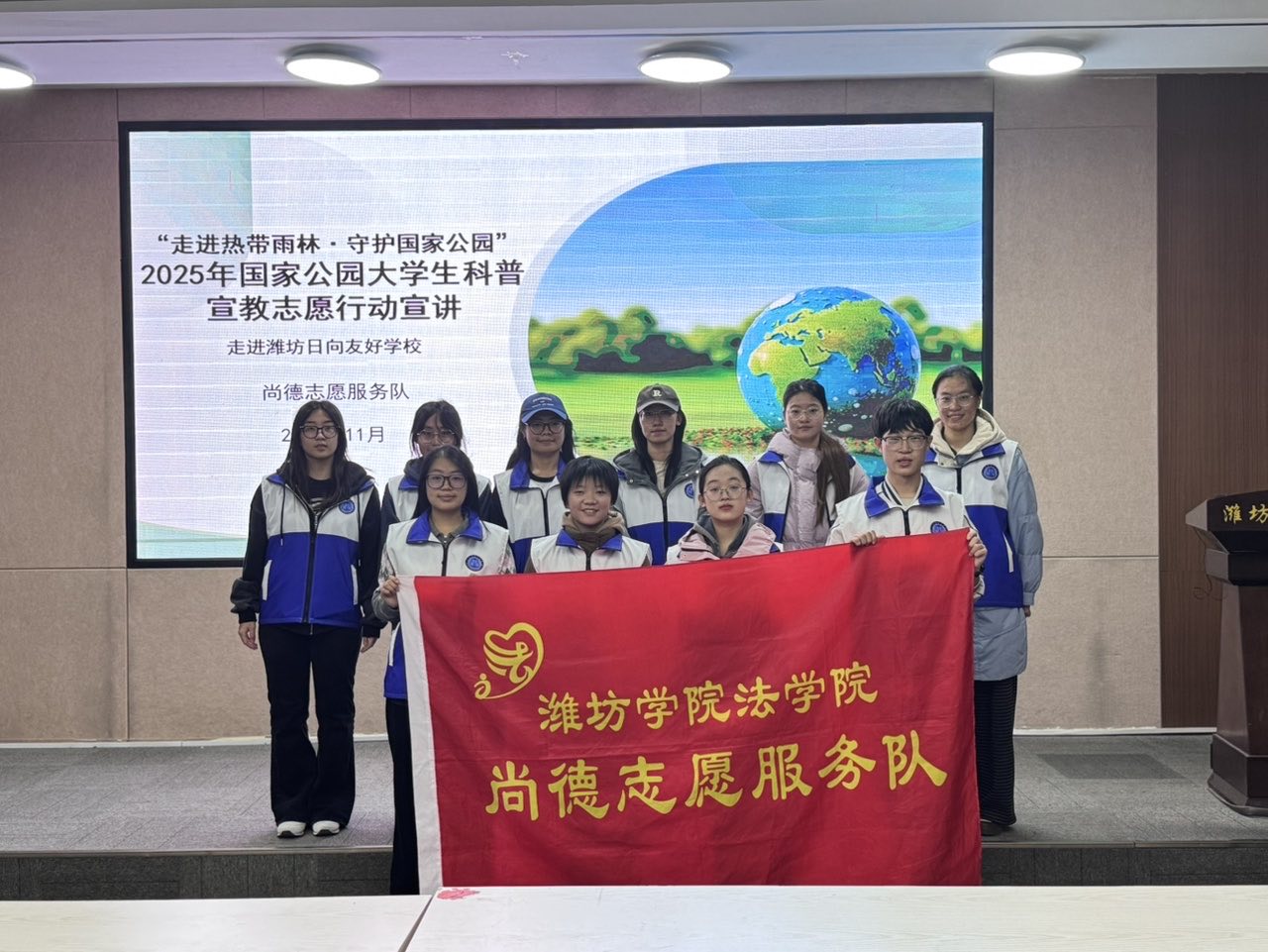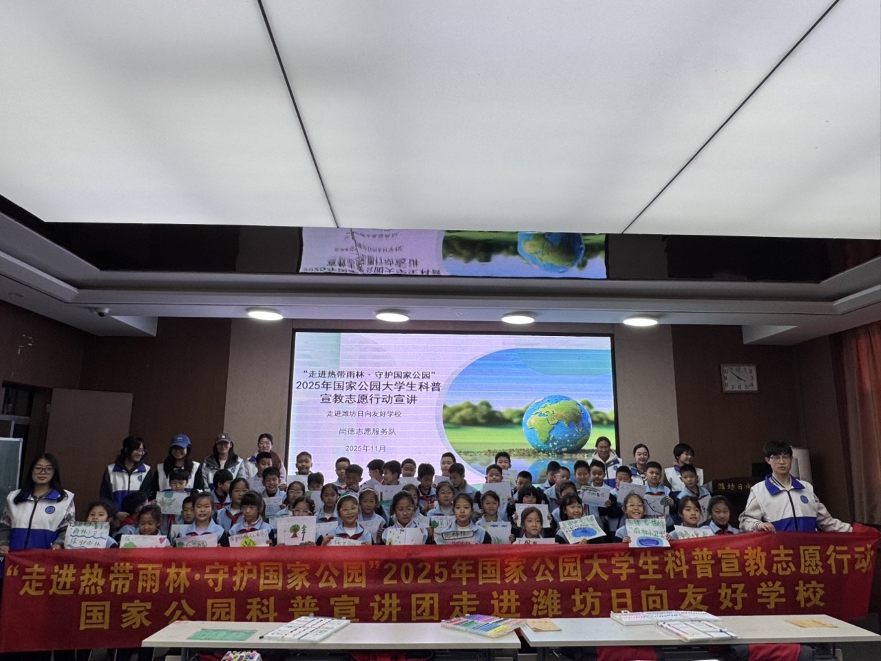 11月20日,法学院尚德志愿服务队走进潍坊日向友好学校,为同学们带来了一场主题为“守护雨林绿脉,争当法治小卫士”的沉浸式生态法治课。作为“走进热带雨林·守护国家公园”2025年国家公园大学生科普宣教志愿行动的重要实践,服务队以寓教于乐的形式,将雨林保护知识与生态法治理念深度融合,引发学生们的热烈共鸣与积极响应。