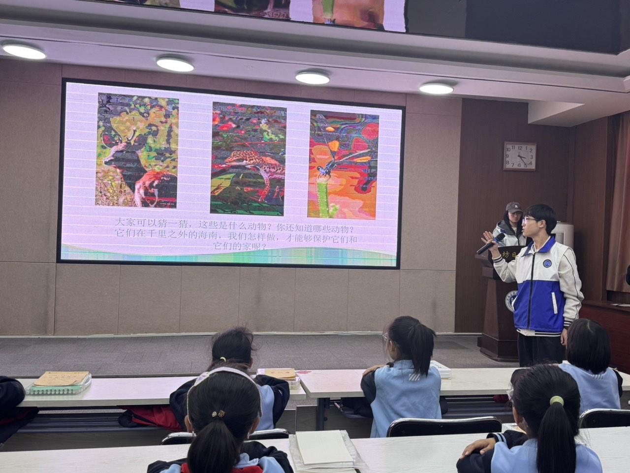 活动开篇的情景导入环节迅速点燃全场热情。志愿者精心呈现树懒、海南长臂猿、坡鹿等雨林珍稀动植物的高清特写,紧接着抛出“树懒为何偏爱高枝”“海南长臂猿的叫声有什么秘密”等趣味问题,配合一段饱含雨林生机的实拍短片,瞬间将同学们带入神秘的热带丛林世界,自然衔接“守护国家公园,共护生物家园”的核心主题,为整场活动奠定生动基调。