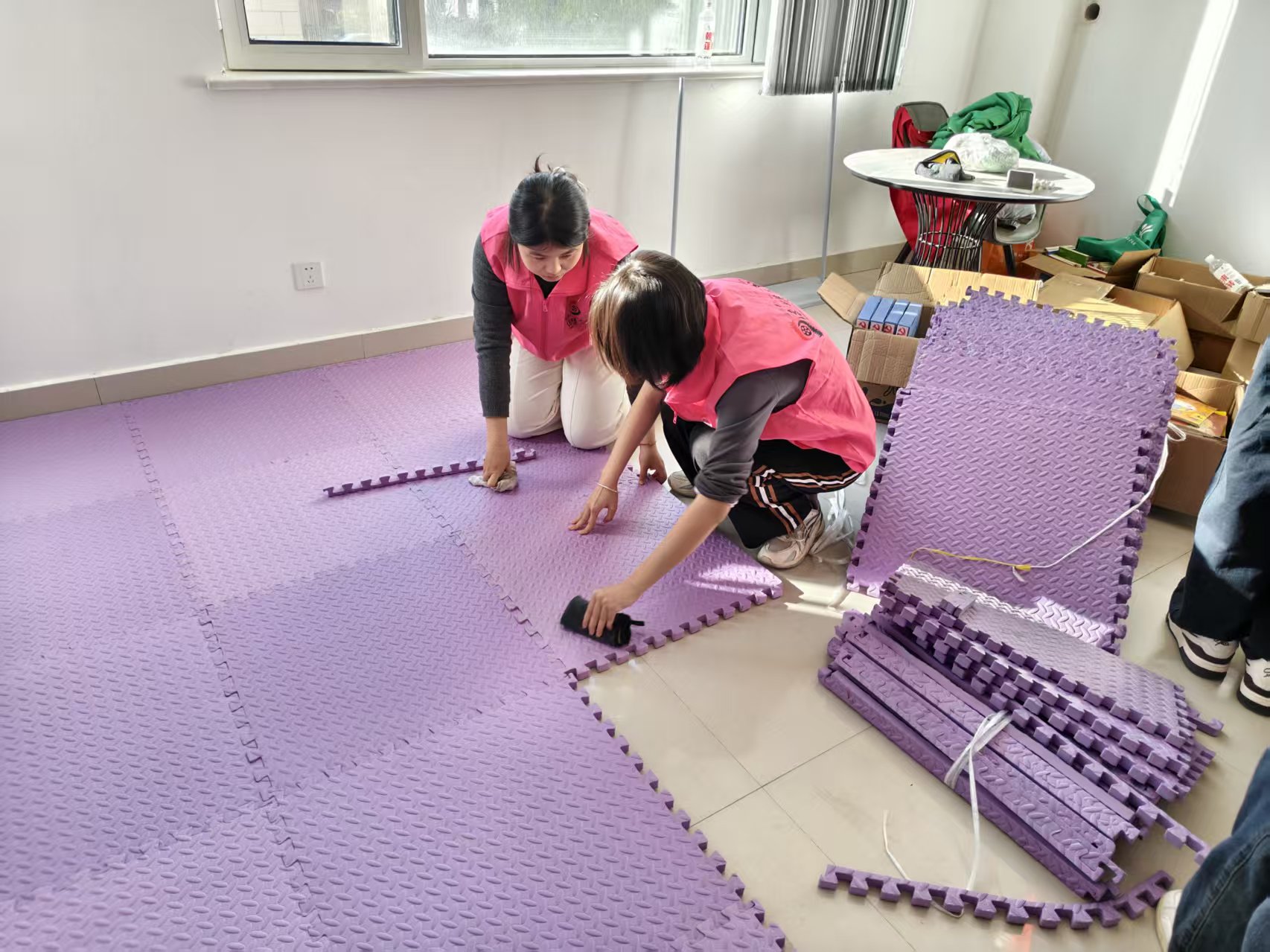 寒冬时节,社区儿童教室地板凉意明显,且儿童活动中存在磕碰隐患。志愿者们走进教室后,迅速开展铺垫工作,大家分工协作、细致操作,经过一小时的忙碌,圆满完成铺垫任务,为孩子们隔绝了地面凉意,有效降低了磕碰风险。志愿服务尾声,志愿者们又共同行动,将教室内所有物品逐一归位,确保教室环境整洁有序。
