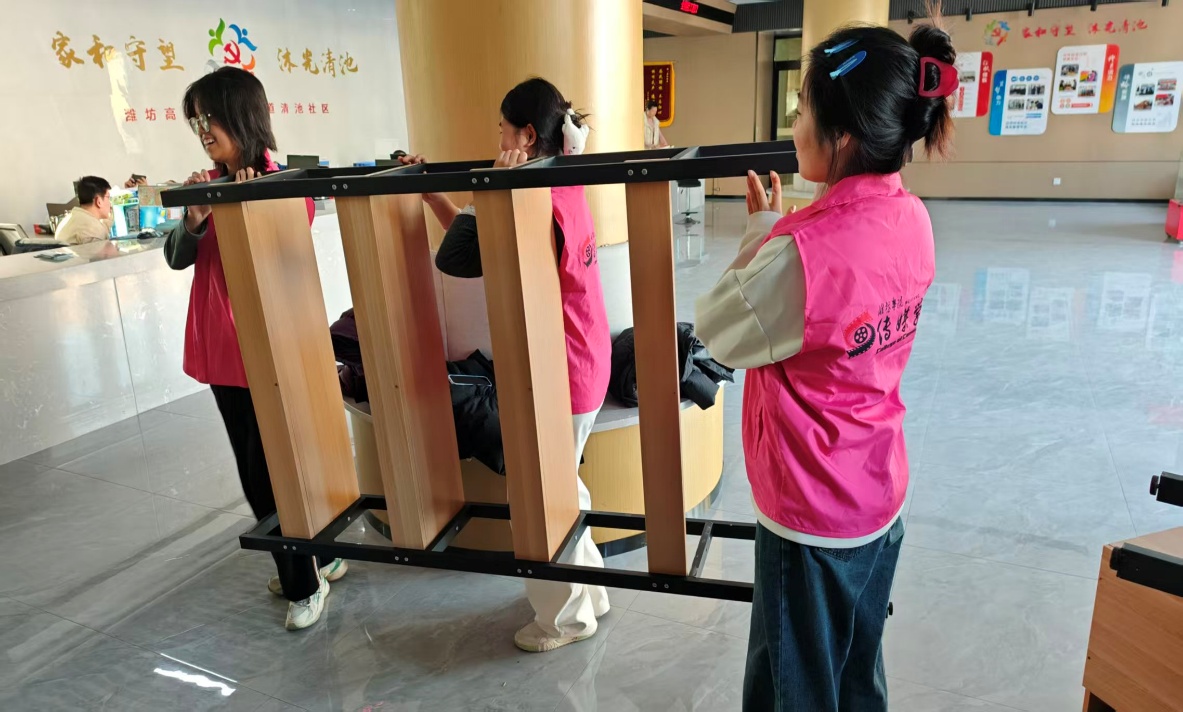 活动当日,志愿者们看到社区空间因物品杂乱而利用不足,便迅速分工行动,大家合力把书架搬到合适的位置,并整理地上散落的书籍,整齐地摆放在书架上。既消除了物品堆积的安全隐患,又提升了孩子们取阅书籍的便捷性,同时增强了社区活动室的实用价值。