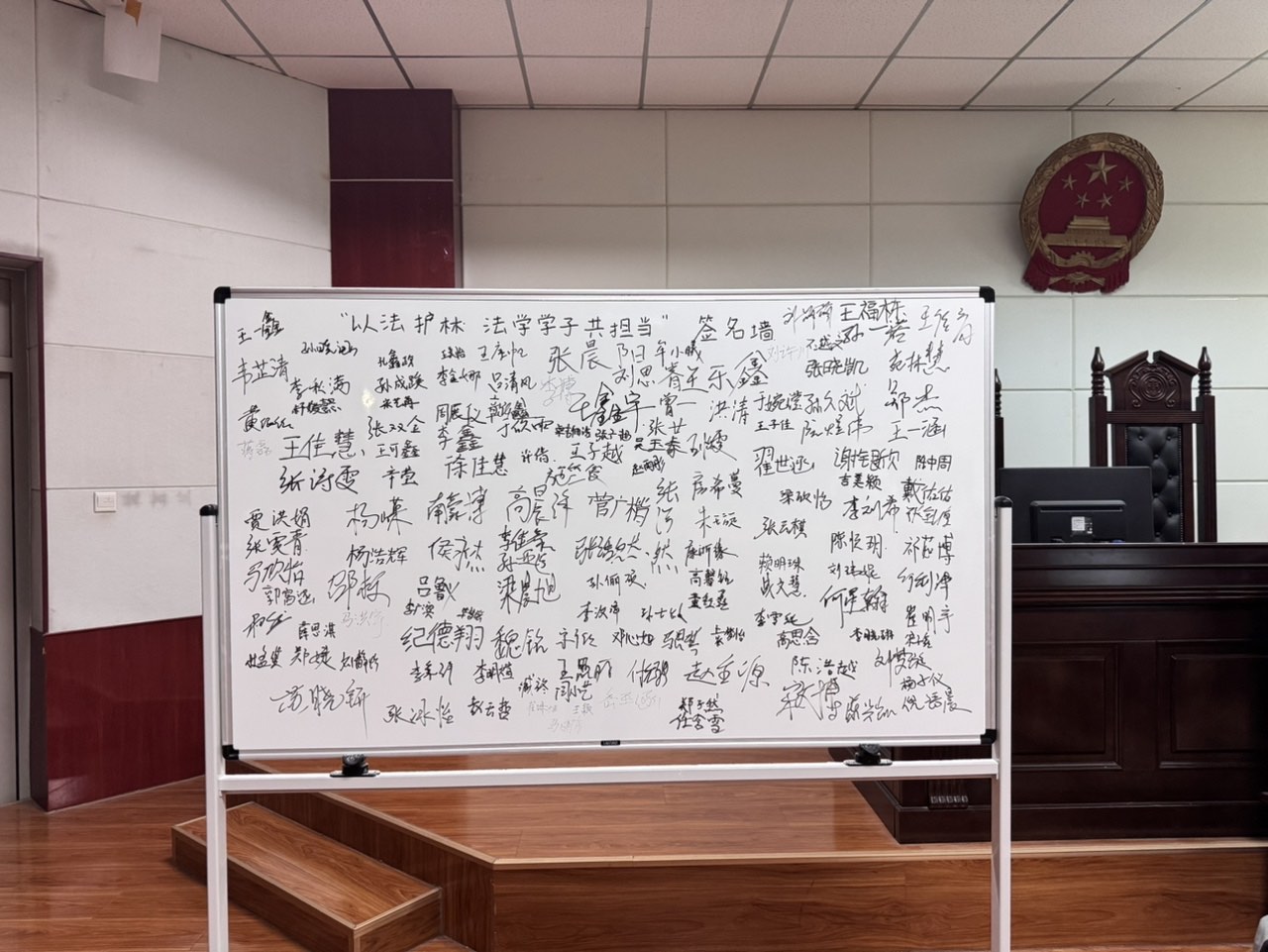 活动尾声,一个写有“依法护林·法学学子共担当”的白板面前排起长队,全体参与学子手持记号笔,郑重签下自己的姓名。笔尖落下的不仅是青春的承诺,更是法学学子对守护绿水青山的责任担当,每一个签名都凝聚着对生态法治建设的坚定信念,为本次实践活动画上了圆满且意义深远的句号。