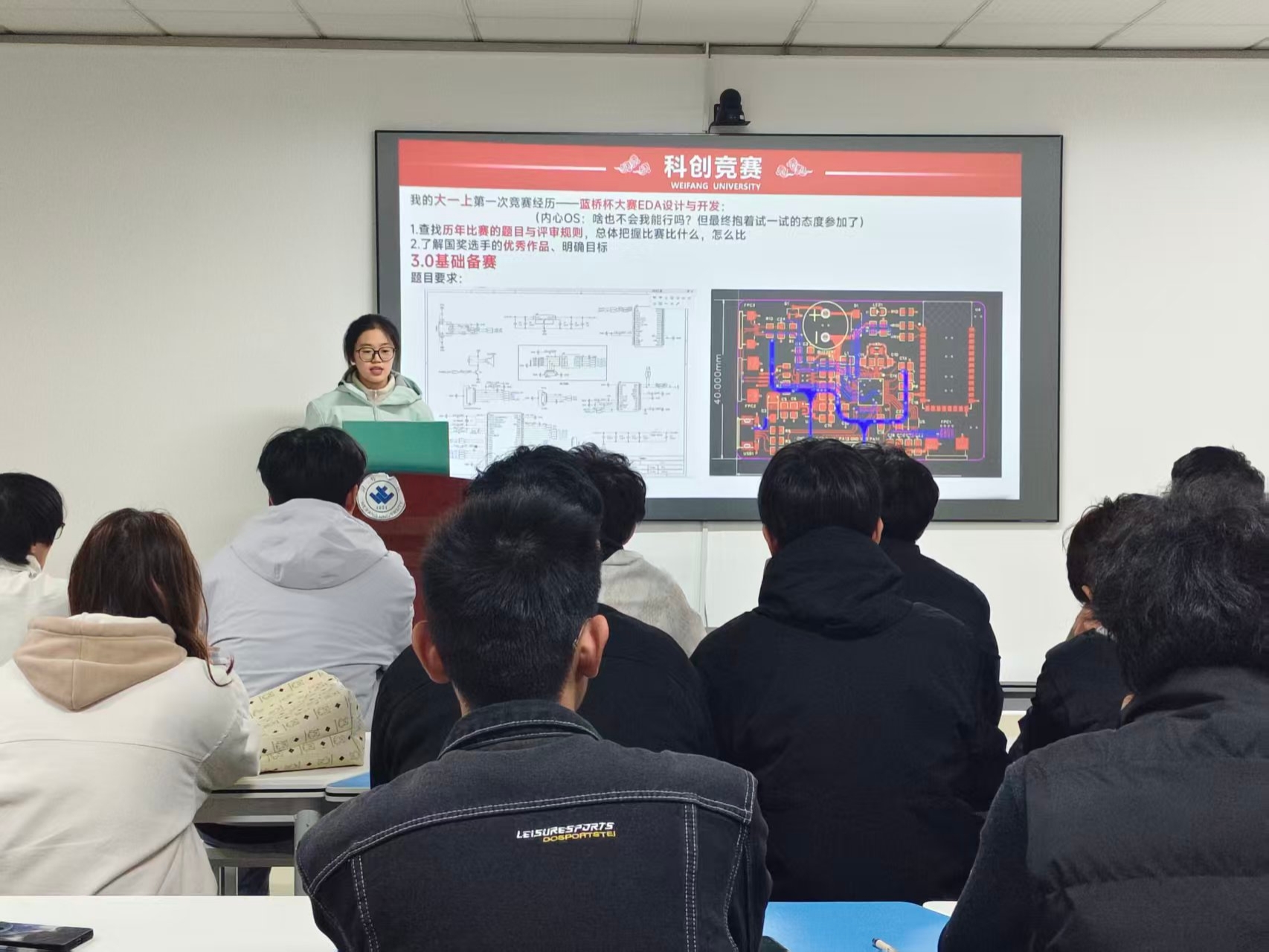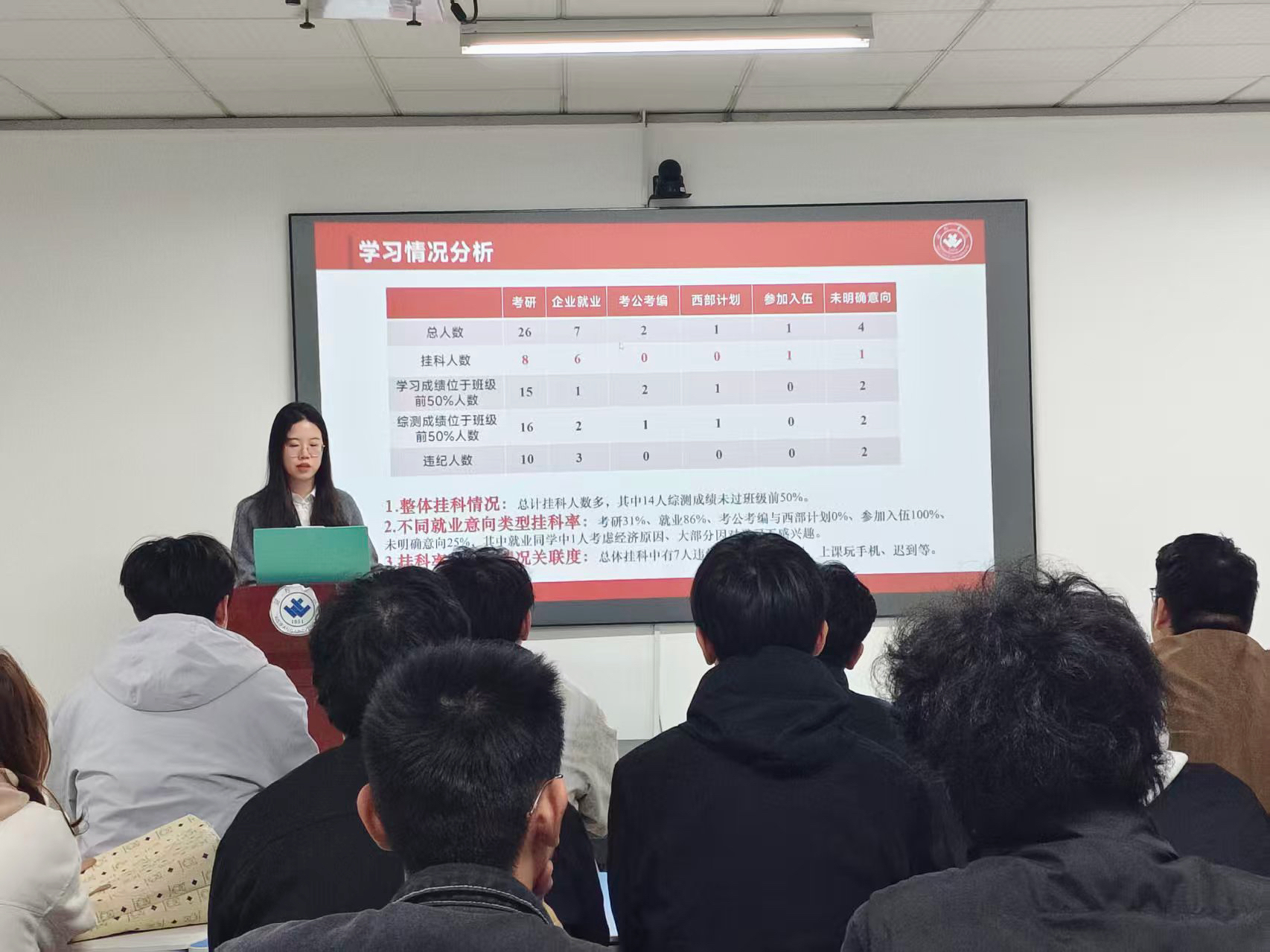 本次班会围绕学情分析、职业决策、行动指南、经验分享四个方面展开。班会伊始,李玉婧以“学情分析,找准方向‘破土’”为切入点,结合考研、企业就业等不同发展意向的学生,深度剖析班级挂科率、成绩分布、违纪情况等核心数据,明确当前班级学情问题及产生原因;随后,她从职业决策、行动指南等方面展开详细讲解,结合学院近两年通信专业就业数据,详细介绍学院“考研复试指导会”“就业大巴”“企业招聘会”等支持措施,以及分析各类就业去向对专业技能、实践经历等不同板块要求,同时针对前期学情问题给出对应解决方案。最后,邀请省政府奖学金获得者、2023级通信工程专业学习与综测成绩双第一的刘晓雯为同学们分享学习经验,她从高效学习方法、科创备赛流程等方面进行讲解,并针对“学生干部如何平衡学习与工作”等问题答疑解惑,现场互动氛围热烈。