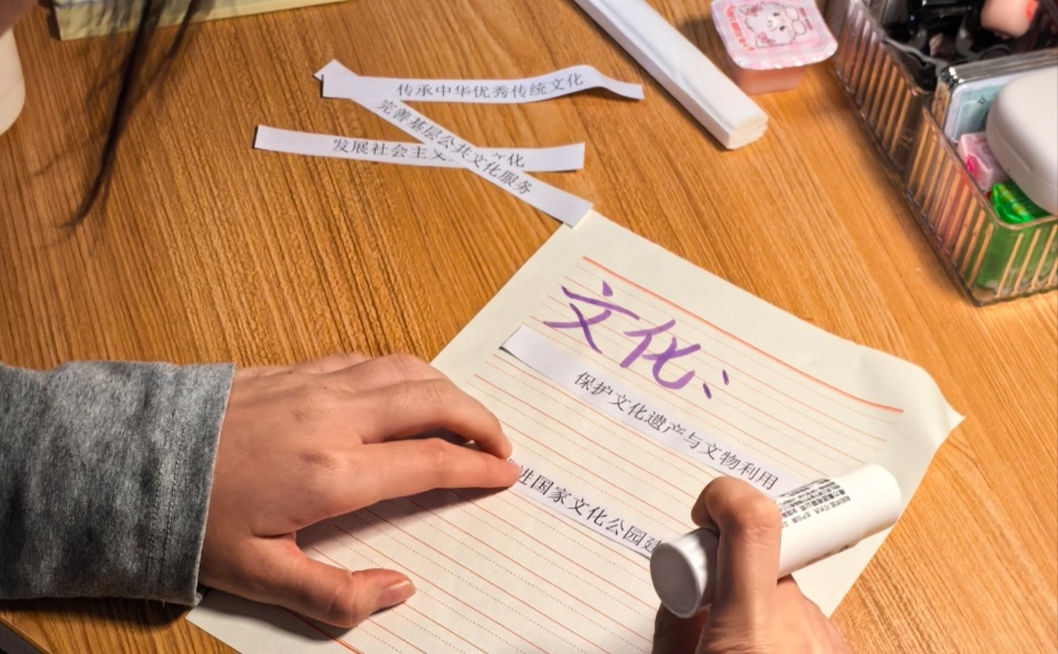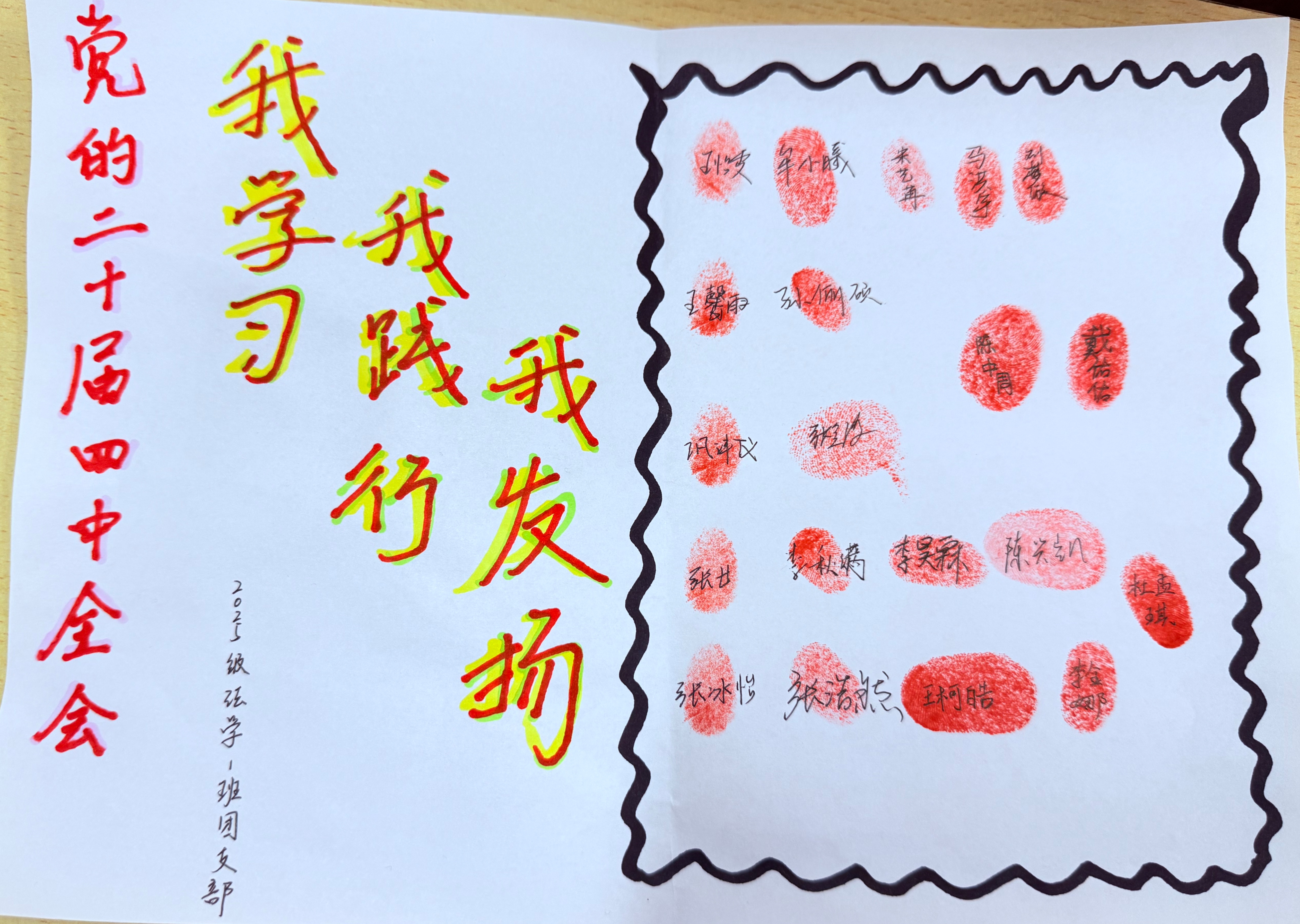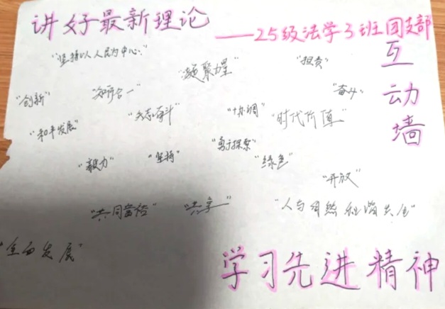 理论学习筑牢思想根基后,系列沉浸式互动环节让青春信念愈发坚定。活动在全体团员整齐嘹亮的集体宣誓中推向高潮,“请党放心,强国有我”的铮铮誓言响彻现场,彰显着青年一代的责任担当。随后开展的“青春印记”特色环节中,同学们在印有多维度发展宏伟蓝图的誓言纸上,郑重按下鲜红手印——一个个饱满的印记层层叠加,不仅是青春的符号,更凝聚成青年对党忠诚、许党报国的铿锵承诺。在热烈的交流研讨中,大家立足专业所学,围绕“制度优势”“法治中国”“高质量发展”等全会关键词各抒己见,将思考感悟认真书写在手印旁,形成了一幅幅“信念为基、思想为魂”的青春画卷。