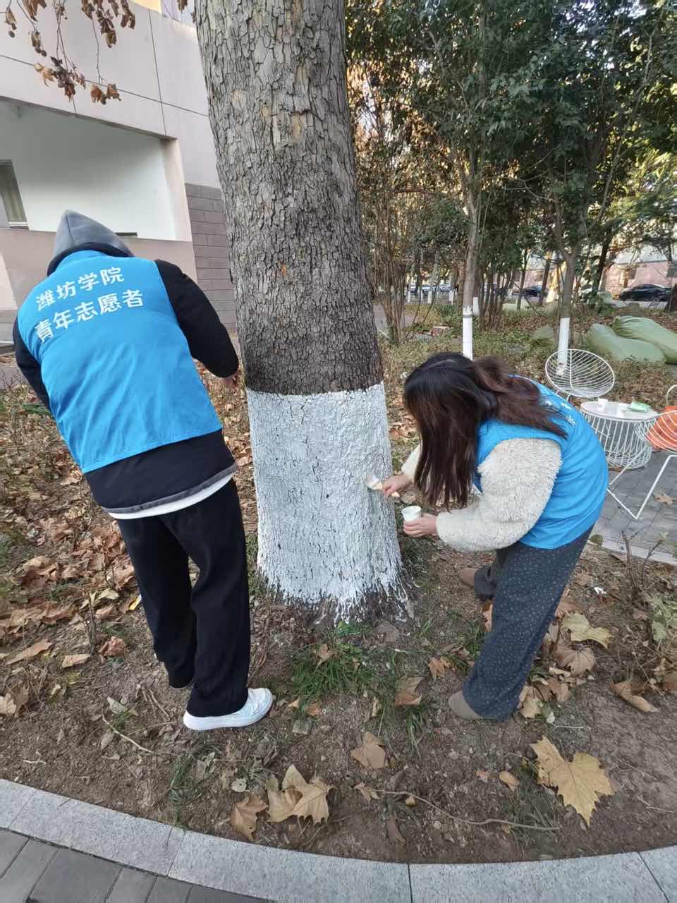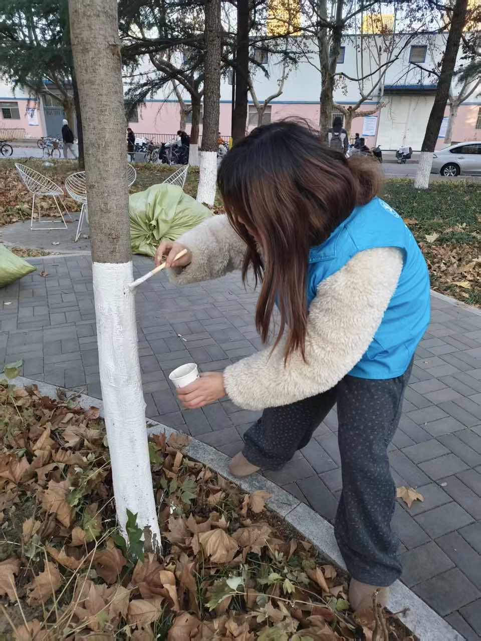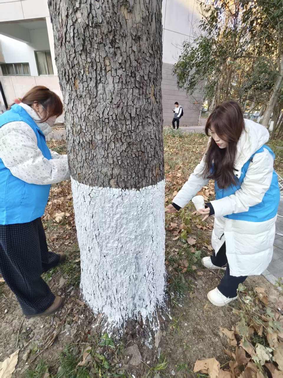 养护现场,志愿者们手持毛刷、搅拌桶等工具,分工协作、干劲十足。经验丰富的队员手把手传授刷白技巧,指导新手把控刷白高度与涂料均匀度;青年队员们认真细致,或搅拌涂料、或弯腰刷白,有条不紊地为树木披上防冻“白装”。寒风中,队员们的身影成为校园里一道温暖的风景线,以实际行动降低树木冬季冻害、病虫害风险,为校园绿植安全过冬筑牢防线。
