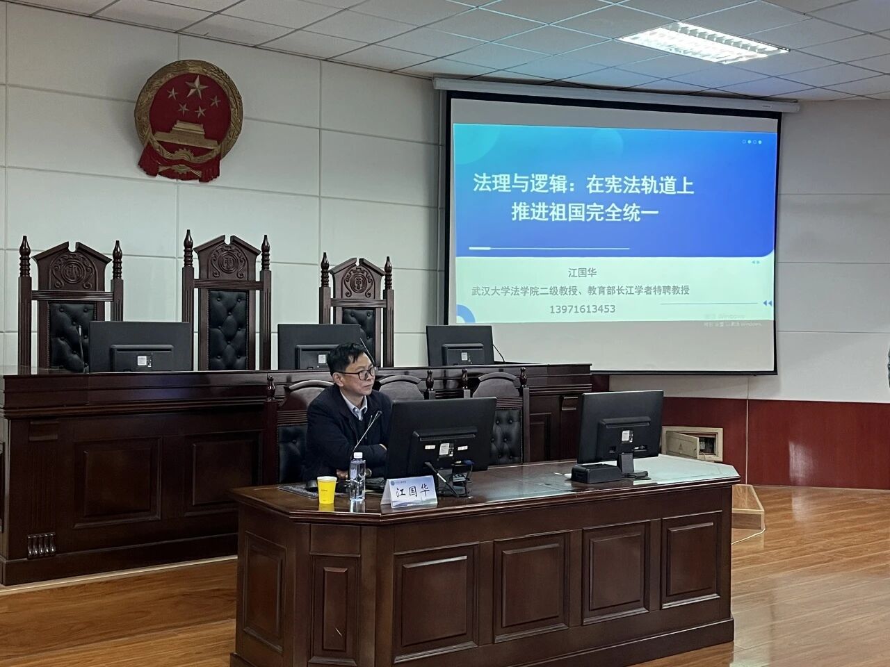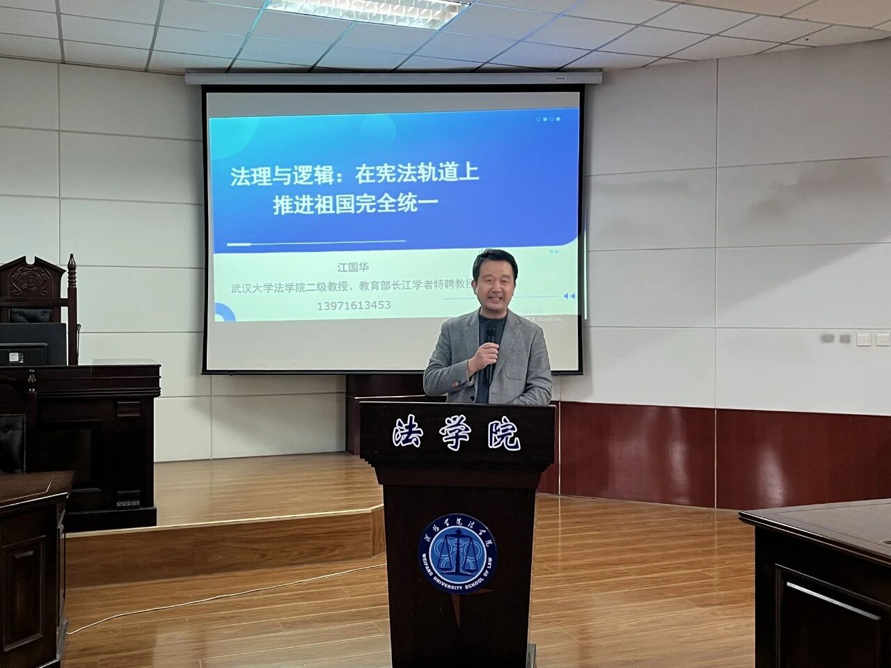 在第十二个国家宪法日来临之际,为弘扬宪法精神、增强统战领域法治意识和国家统一意识,12月4日,学校统战部与法学院联合举办宪法日专题讲座,特邀武汉大学法学院教授江国华,在人合楼8321教室作题为“法理与逻辑:在宪法轨道上推进祖国完全统一”的专题讲座。讲座由法学院院长杜立聪主持。