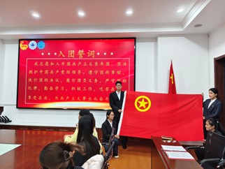 在宣誓环节,领誓人吴玉叶带领全体新团员面向鲜红的中国共产主义青年团团旗,高举右拳、昂首肃立。“我志愿加入中国共产主义青年团,坚决拥护中国共产党的领导……”铿锵有力的誓言回荡在会场,字字千钧,既是新团员对团组织的郑重承诺,更是他们矢志奋斗的青春宣言。随后,入团介绍人吴玉叶现场宣读《中国共产主义青年团章程》部分章节,从权利与义务、责任与担当等方面,帮助新团员进一步明晰身份认知,筑牢思想根基。