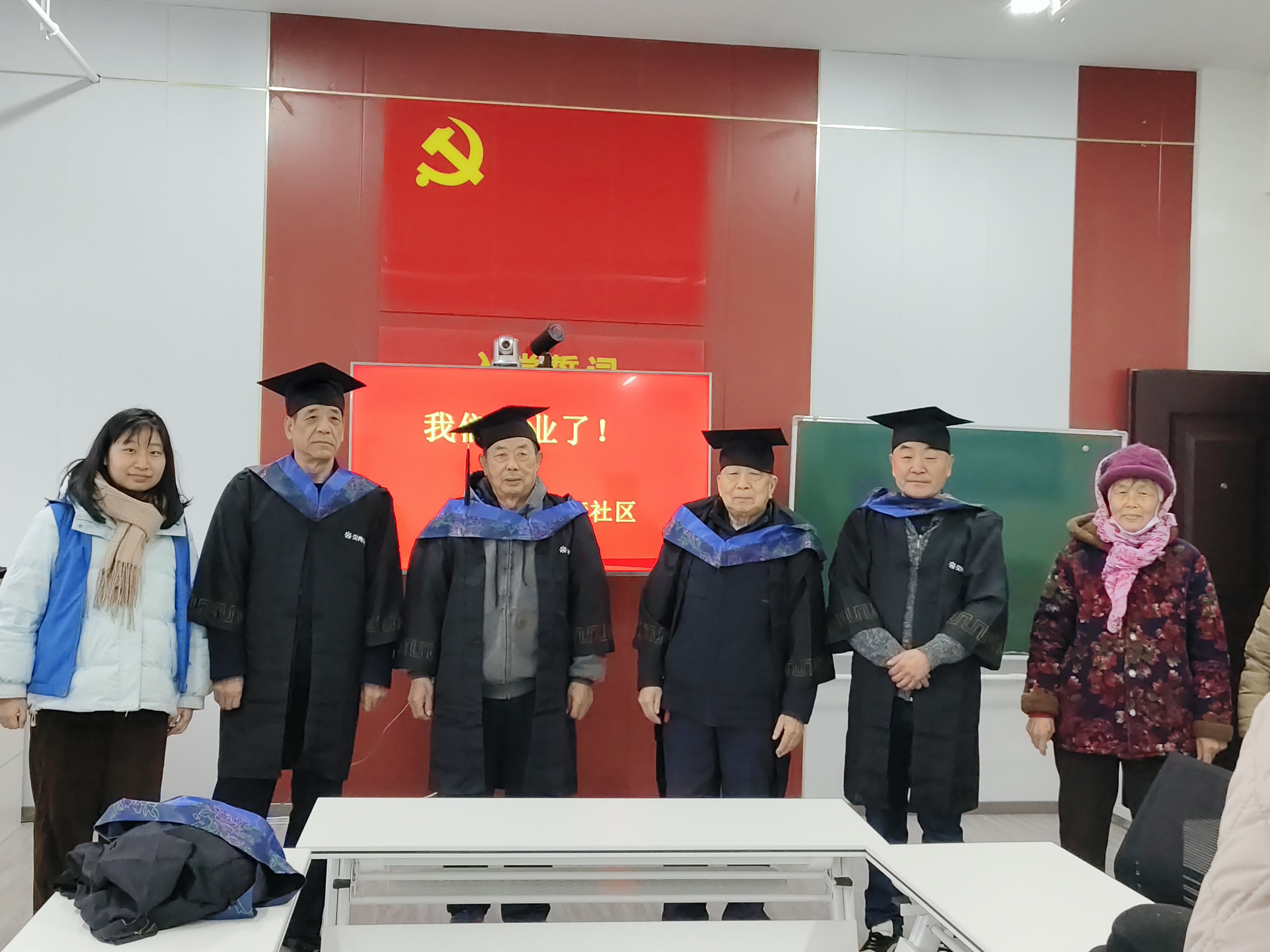 为了给积极参与学习的老年学员们一份独特而难忘的纪念,志愿者们精心策划并举办了一场充满温情与敬意的“毕业仪式”。现场气氛温馨而庄重,志愿者们不仅为每一位老人穿戴整齐的学士服、庄重地佩戴上学士帽,还为他们逐一颁发了特别定制的“结业证书”。老人们脸上洋溢着幸福与自豪的笑容,纷纷与志愿者合影留念,用镜头记录下这意义非凡的一刻,让这份跨越代际的温暖、尊重与荣誉永远定格在美好的记忆中。