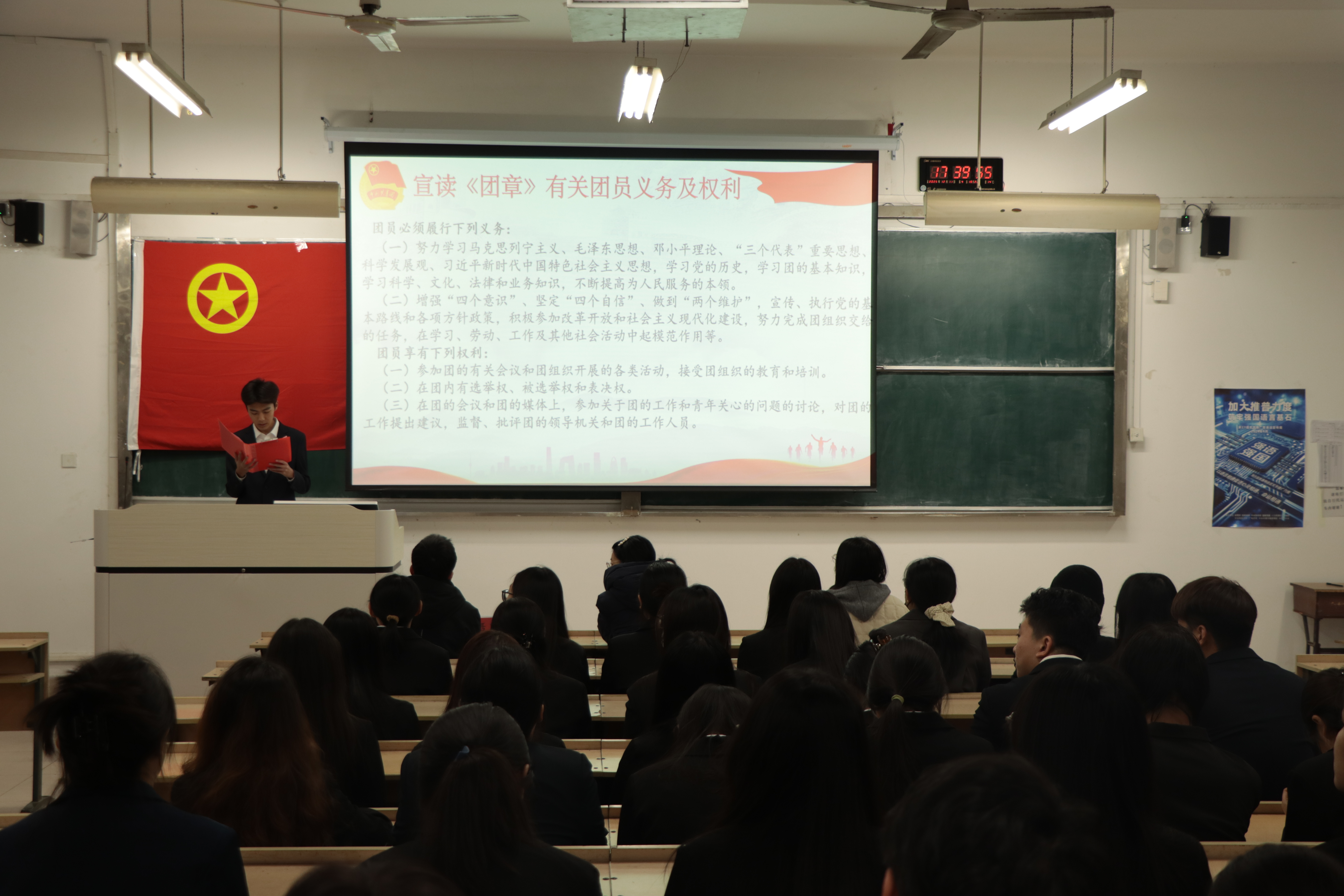 仪式在庄严的国歌中正式开始。全体人员肃立,齐声高唱,激昂的旋律拉开了入团仪式的序幕,也标志着又一批先进青年正式迈入共青团的大门。