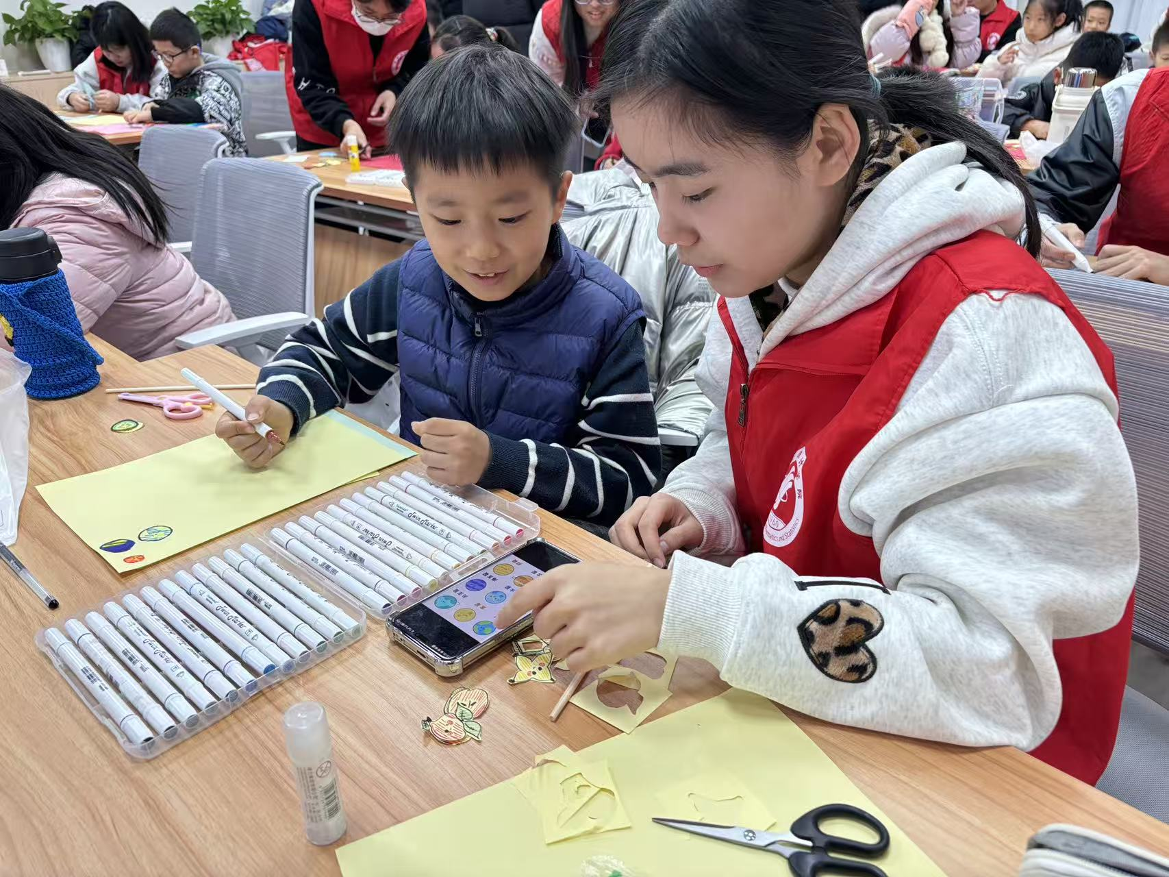 手工创作环节成为孩子们展现创意与动手能力的趣味平台。志愿者指导大家动手制作纸艺糖葫芦,逐步演示绘画图案、剪裁纸张的步骤,孩子们神情专注,细心调整每一个细节——有的精心勾勒糖葫芦的轮廓,有的认真粘贴装饰的纹样。一张张普通的彩纸,在童心的创造中,化作一串串充满童趣的纸艺糖葫芦。孩子们拿着自己的作品,脸上洋溢着满满的成就感。