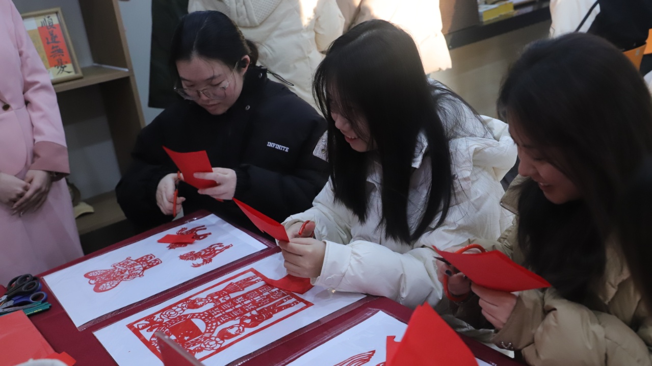 活动现场,任立春强调,要推动非遗特色活动与专业知识深度融合,让非遗文化在校园中焕发新生机。杨存兰以红纸为料、剪刀为笔,寥寥数剪间,花鸟、生肖等图案便跃然纸上,精湛技艺引得同学们阵阵惊叹。她还细致讲解剪纸的历史渊源与技法要点,同学们纷纷上手实践,在从生疏剪刻到渐入佳境的过程中,沉浸式感受剪纸艺术的独特韵味。