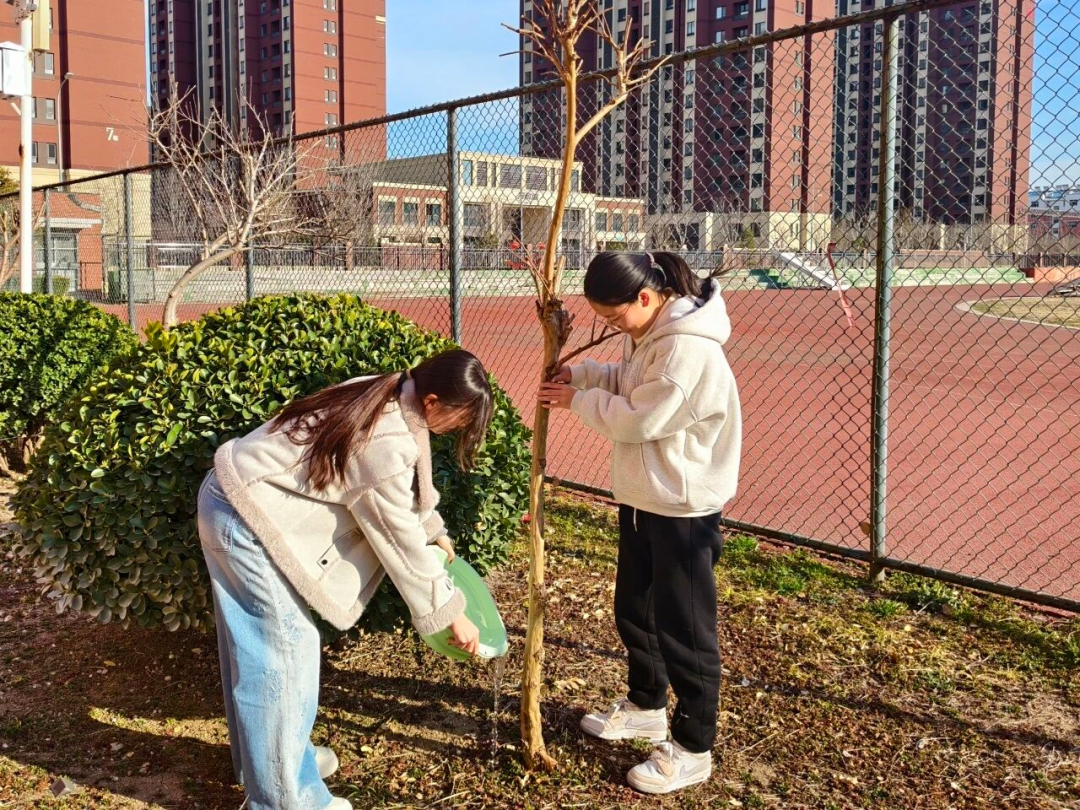 活动现场,春意盎然,干劲冲天。同学们在指定区域迅速集结,分工明确,协作有序。铁锹入土、扶苗培土、提桶浇水,每一个环节都有条不紊。来自不同年级的同学们两两一组,有的挥汗如雨,专注于将小树苗稳稳固定;有的欢声笑语,认真检查每一处土坑是否夯实。阳光下,大家的身影与嫩绿的新苗构成了一幅最动人的青春画卷。虽然汗水浸湿了衣衫,但大家爱护环境的决心在此次实践。
