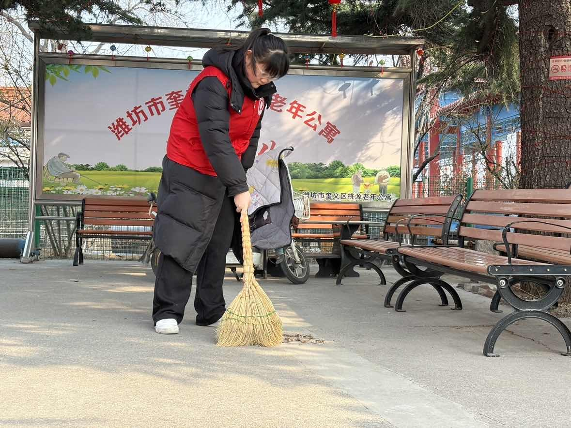 志愿者们还对公寓公共区域展开全面细致的清扫。大家分工协作,有的认真清扫走廊与庭院地面,有的仔细擦拭门窗、扶手与桌椅,不放过任何一个卫生死角。认真整理公寓内杂乱摆放的桌椅,对公寓外停放的非机动车进行规范摆放,以实际行动为老人们营造出干净整洁、舒适宜居的生活环境。大家脸上始终洋溢着热情的笑容,用行动诠释着青春的责任与担当。
