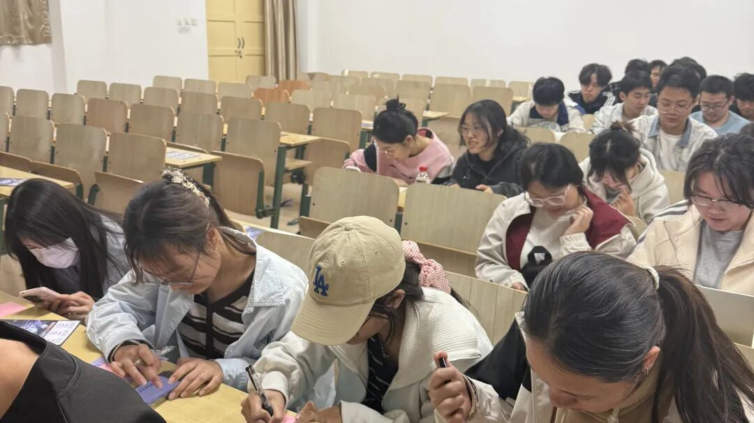 书写完成后,同学们将纸条折好,统一打乱。随后,大家依次抽取纸条,当众大声念出纸条上的内容。没有繁琐的上台表演环节,无需刻意的仪式感,全班同学围坐在一起,真诚分享每一份善意。当一句句温暖的承诺被念出,教室里洋溢着满满的暖意,同学们在互动中相互传递温暖,也在彼此的分享中深化了对“互助、友爱、奉献”的理解。