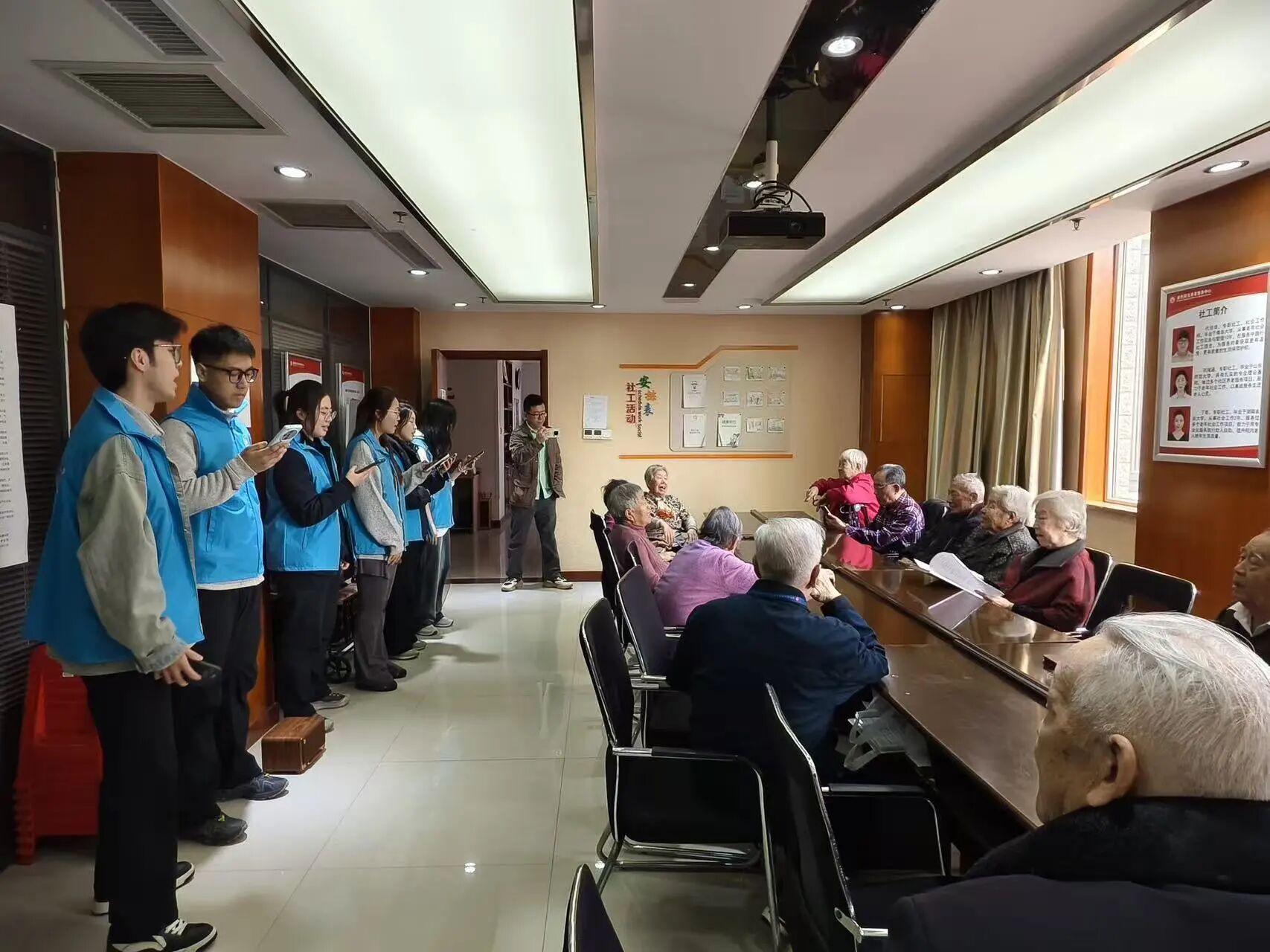 作为音乐专业的学子,同学们充分发挥专业优势,将艺术表演与志愿服务相结合,为老人们带来了一场精彩纷呈的歌曲演唱。《绒花》《唱支山歌给党听》《映山红》等经典曲目依次上演,同学们歌声悠扬、情感真挚,用饱满的热情和专业的演唱功底,为老人们献上了一场视听盛宴。熟悉的旋律唤起了老人们的美好回忆,不少老人跟着旋律轻轻哼唱、拍手伴奏,现场掌声不断、欢声笑语连连。悠扬的歌声回荡在养老服务中心的每一个角落,让老人们在温馨的氛围中感受到陪伴的快乐,也让雷锋精神在歌声中得到传承与发扬。