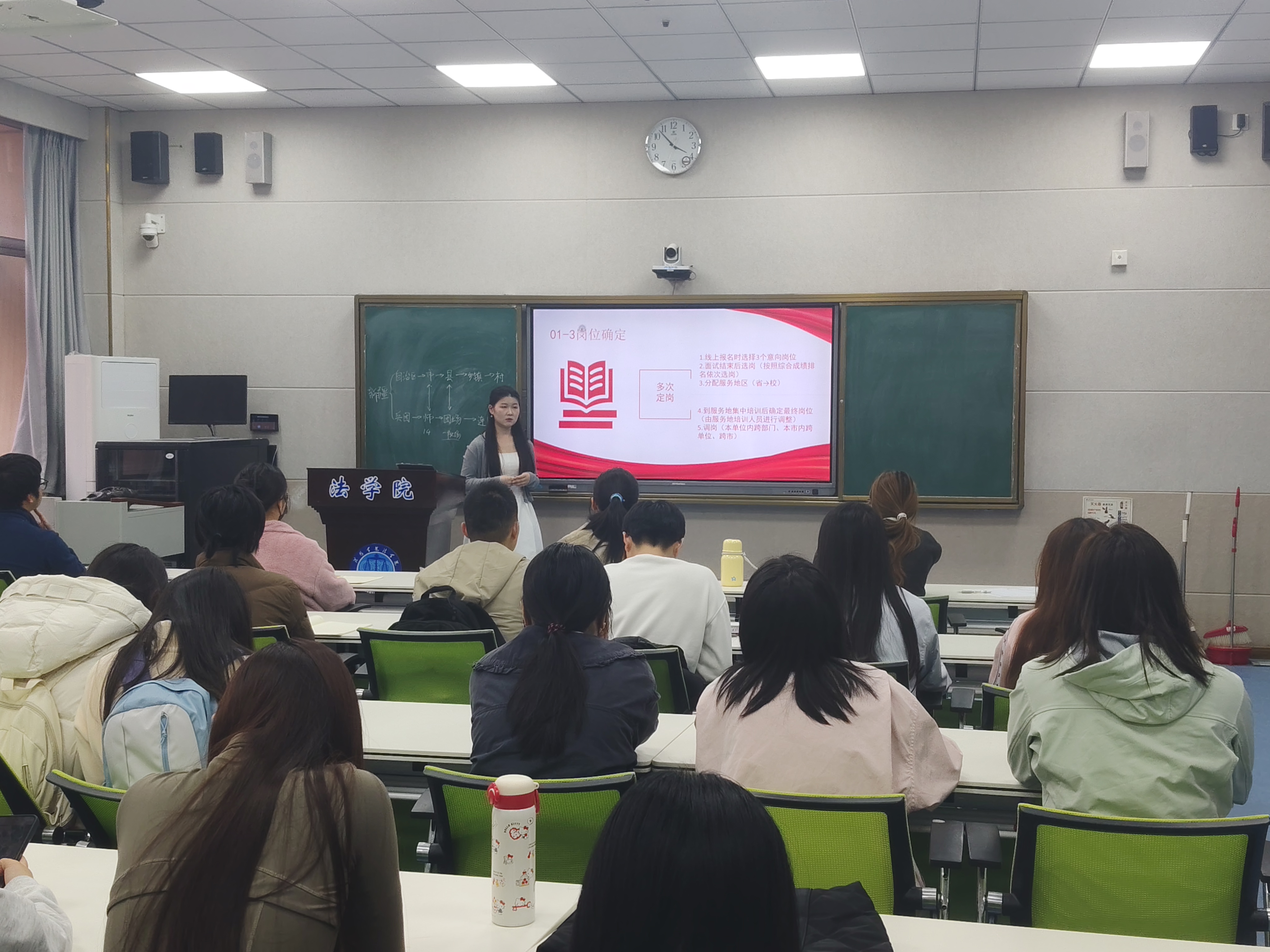 为深入推进思想政治教育与就业指导工作深度融合,引导广大青年学子树立扎根基层、奉献社会的理想信念,4月9日下午,法学院于人合楼8318教室成功举办大学生志愿服务西部计划宣讲会。本次活动特邀2023届优秀校友、西部计划志愿者赵志霞主讲,法学院2026届毕业生到场参会。