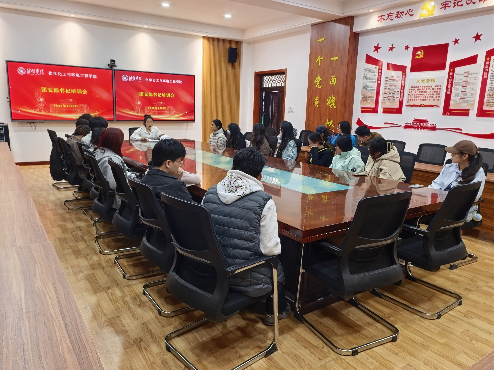 为进一步夯实基层团组织建设,规范团员发展、推优入党等核心工作流程,明确遴选标准,全面提升团支部书记履职能力与工作质效,4月8日中午12:00,化学化工与环境工程学院于人合楼 8213 会议室召开团支部书记专题培训会。学院团委负责人赵文婷主持会议并作专题培训,2024 级、2025 级全体团支部书记参加会议。