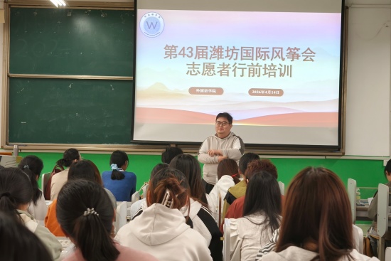 为扎实做好第43届潍坊国际风筝会暨2026潍坊风筝嘉年华的志愿服务保障工作,提升志愿者的专业素养、服务水平和安全意识,4月14日下午,外国语学院举行了国际风筝会志愿者行前动员培训大会。学院副院长王珂、潍坊国际风筝会综合服务中心相关领导出席本次培训会。外国语学院精心选拔49名英、法、日、韩语专业学生担任本次活动志愿者。